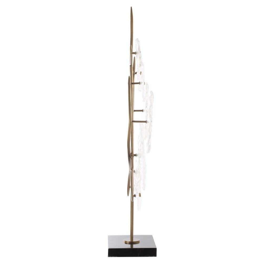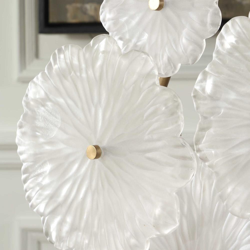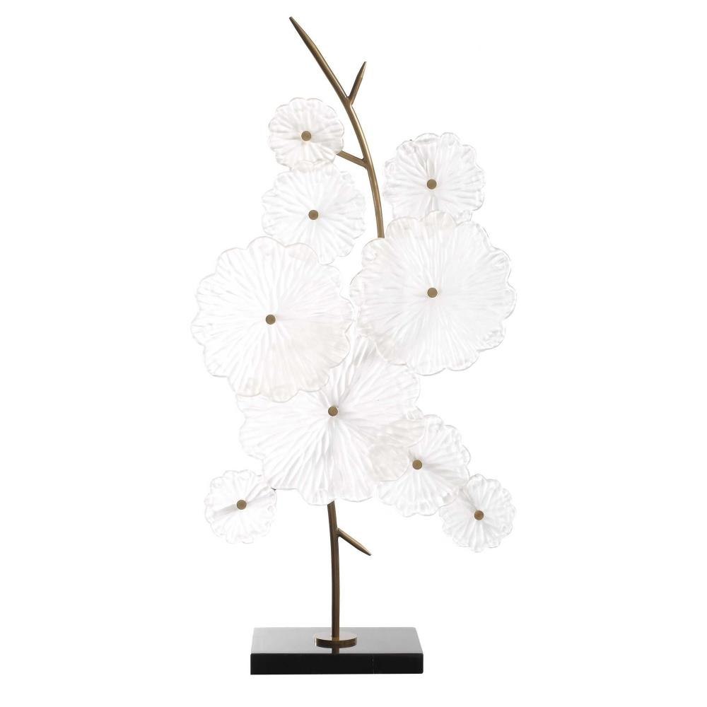 Add An Elegant Touch To Your Space With This Stunning Floral Sculpture. Featuring Delicate Glass Blossoms, Golden Stems, And A Sleek Black Marble Base. This Piece Exudes Sophistication And Charm.