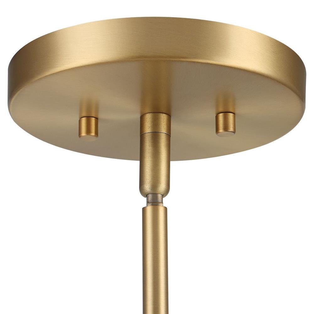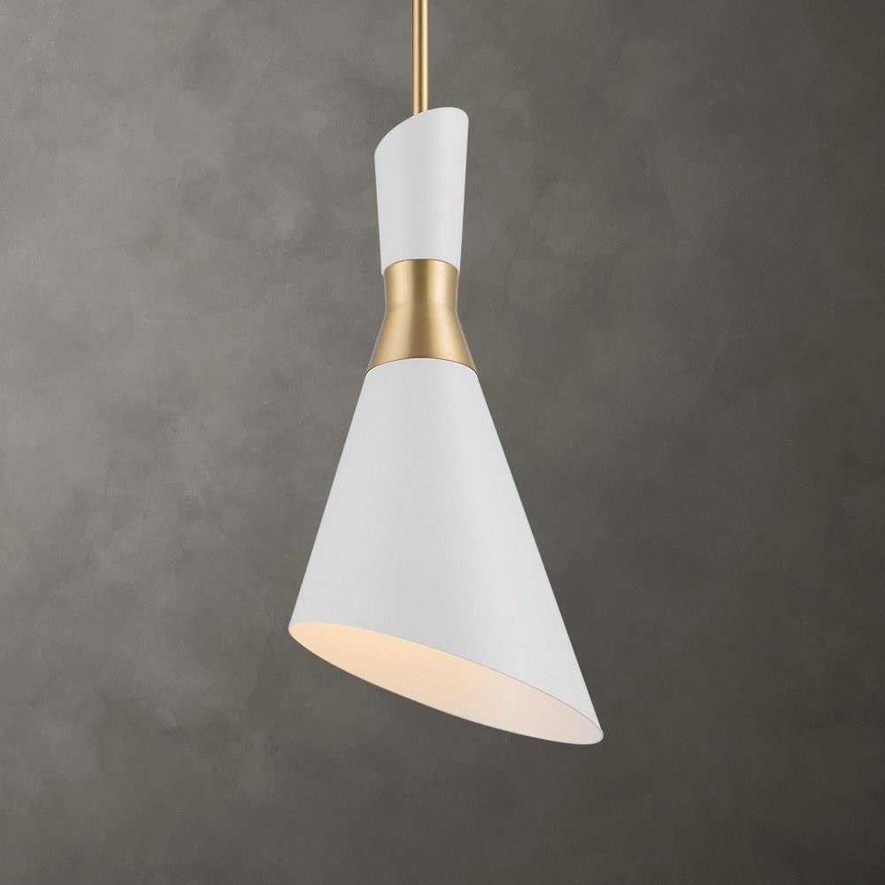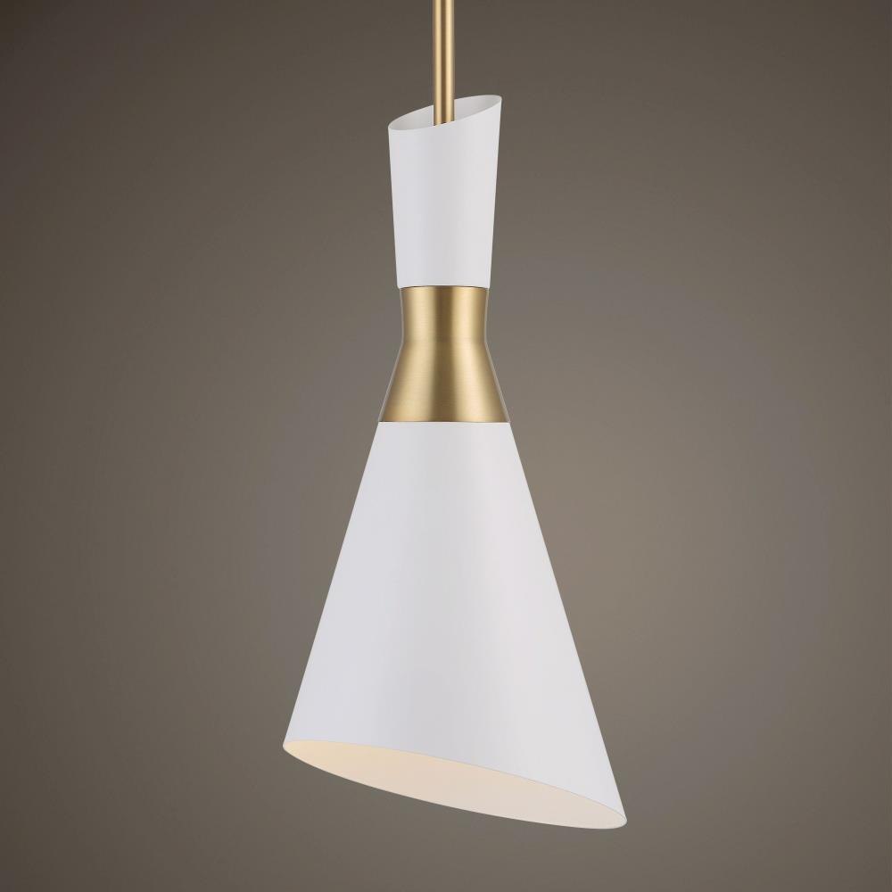Modern Lines & Shapes In A White & Antique Brass Finish With A Retro Feel Give Us A Classic Looking Mid-century Cone Pendant. 1-60 Watt Max Edison Socket. Bulb Not Included. Supplied With 15' Wire, 3-12" Stems And 1-6" Stem For Adjustable Installation.