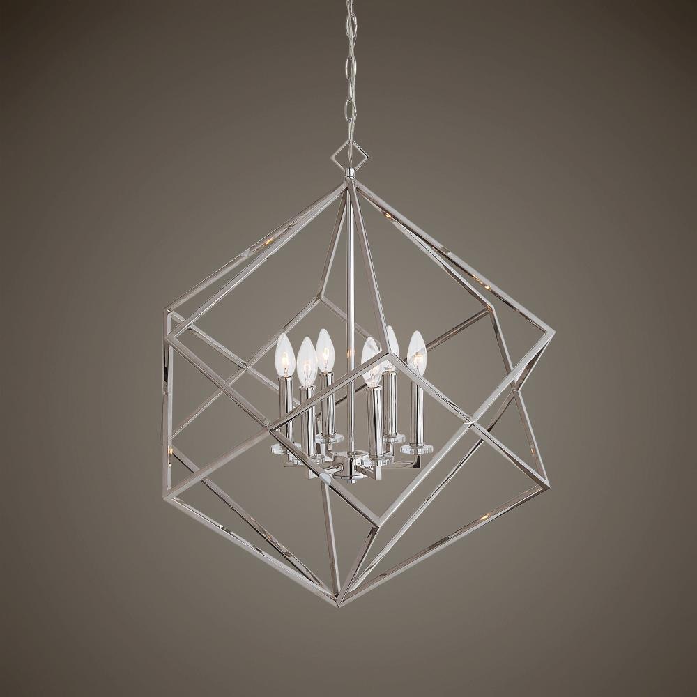 An Elegant Polished Nickel Cube Interlocked With Its Twin, At The Center Of Their Intersection Is A 6 Light Candle Cluster With Mini Crystal Bobeches. 6-60 Watt Max, Candelabra Sockets. Includes 15'wire & 7'chain.