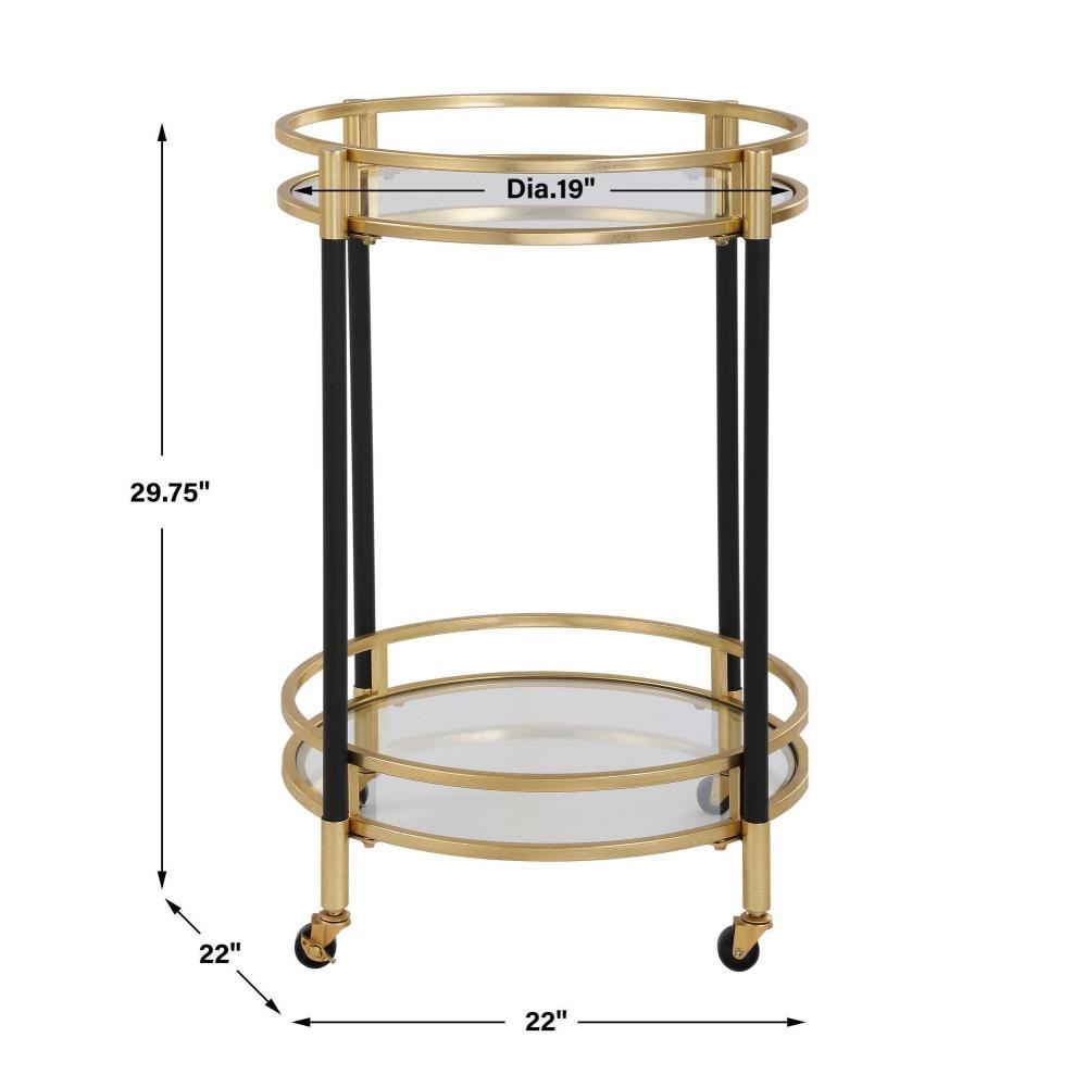 A Tasteful Bar Cart With A Round Design Ready For Effortless Placement In Any Space. Comprised Of Matte Black Iron That Perfectly Accentuates Its Soft Gold Leaf Features. Two Glass Shelves Are Ready To Showcase Any Of Your Treasured Glasses Or Drinks. Complete With Rolling And Locking Casters.