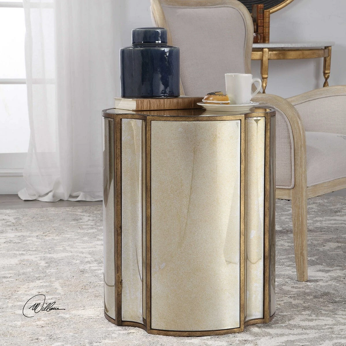 HARLOW MID CENTURY MODERN ANTIQUED CURVED MIRROR & METAL END ACCENT TABLE 24888