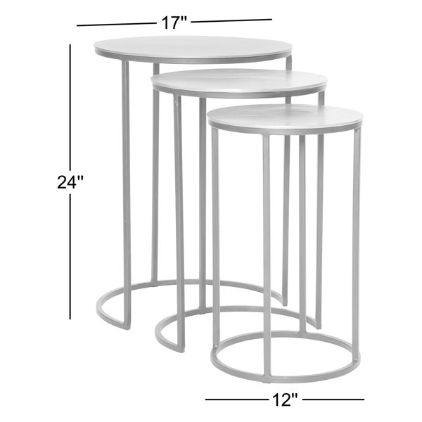 This 3-piece set of nesting tables gives you extra surface space when you need it and easily tucks away when you don't. Each piece is made from a metal frame with a sleek black finish. The large 24" tall and medium 22" tall tables have a half-moon, C-shaped base while the smallest 20" tall table has a perfect circle base to complete the look. Up above, the tabletop is made from cast aluminum with a plated antique nickel finish that's sleek and approachable. Best of all, this set arrives fully assembled, so all you have to do is find the perfect spot for them.