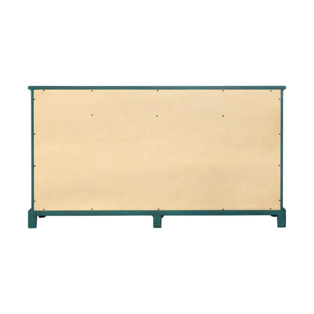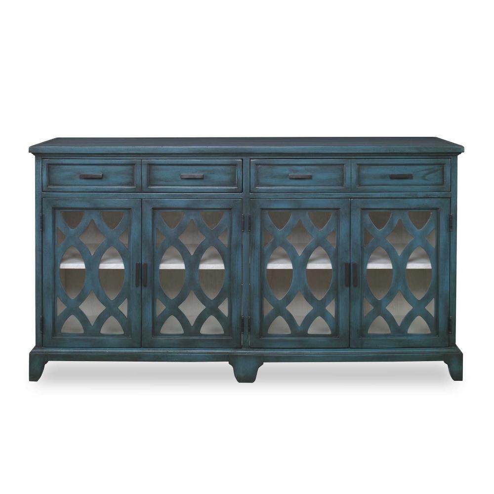 Featuring Solid Wood Construction, This Credenza Showcases Enhanced Cabinet Doors With Intricate Wooden Cutouts Over Glass. Finished In A Lagoon Green Exterior With A Contrasting Antique White Finished Interior, And Accented With Coffee Bronze Finished Hardware. Open Shelf Styling Allows Versatility As A Sideboard Or Media Console. Interior Shelves Are Adjustable.