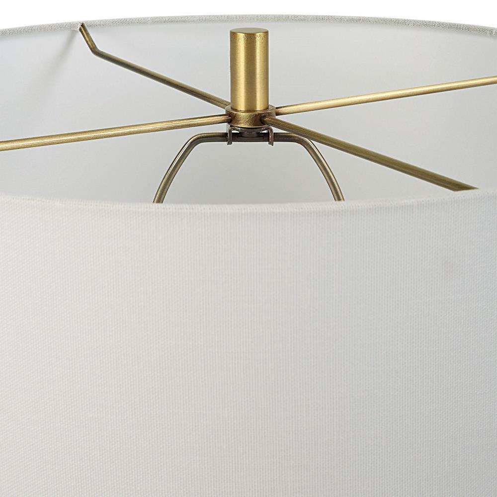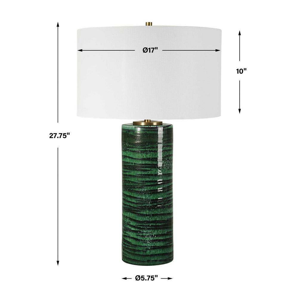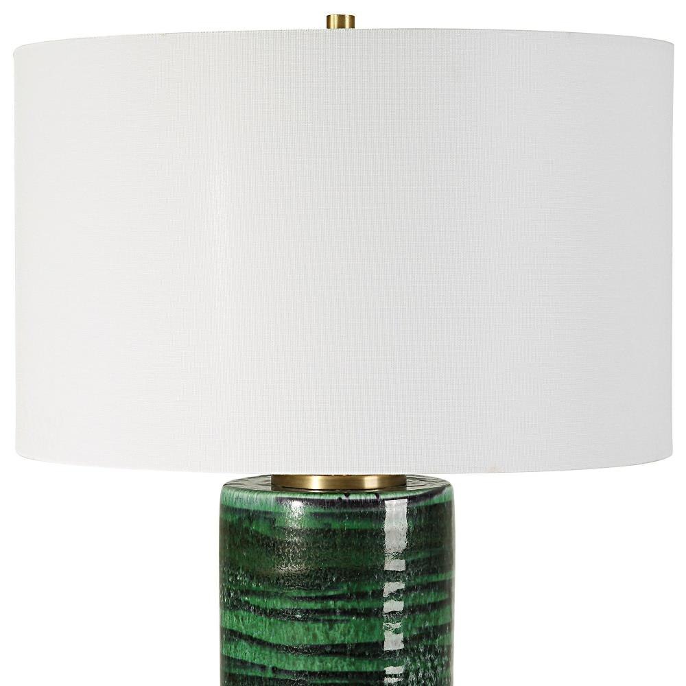 This Table Lamp Features A Ceramic Base Finished In A Two-toned Dark And Light Emerald Green Glaze With An Abstract Stripe Pattern, Accented With Antique Brass Plated Details. Round Drum Shade Has A Casual White Linen Fabric With Natural Slubbing. Due To The Nature Of Fired Glazes On Ceramic Lamps, Finishes Will Vary Slightly.