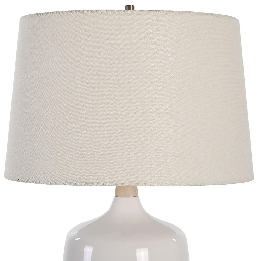 This Ceramic Table Lamp Featuring A White High Gloss Glaze Accented By Brushed Nickel Finishes. The Natural Wood Base And Neck Adds Organic Elements To This Versatile Design. A Slightly Tapered Off-white Linen Hardback Shade Completes The Piece.