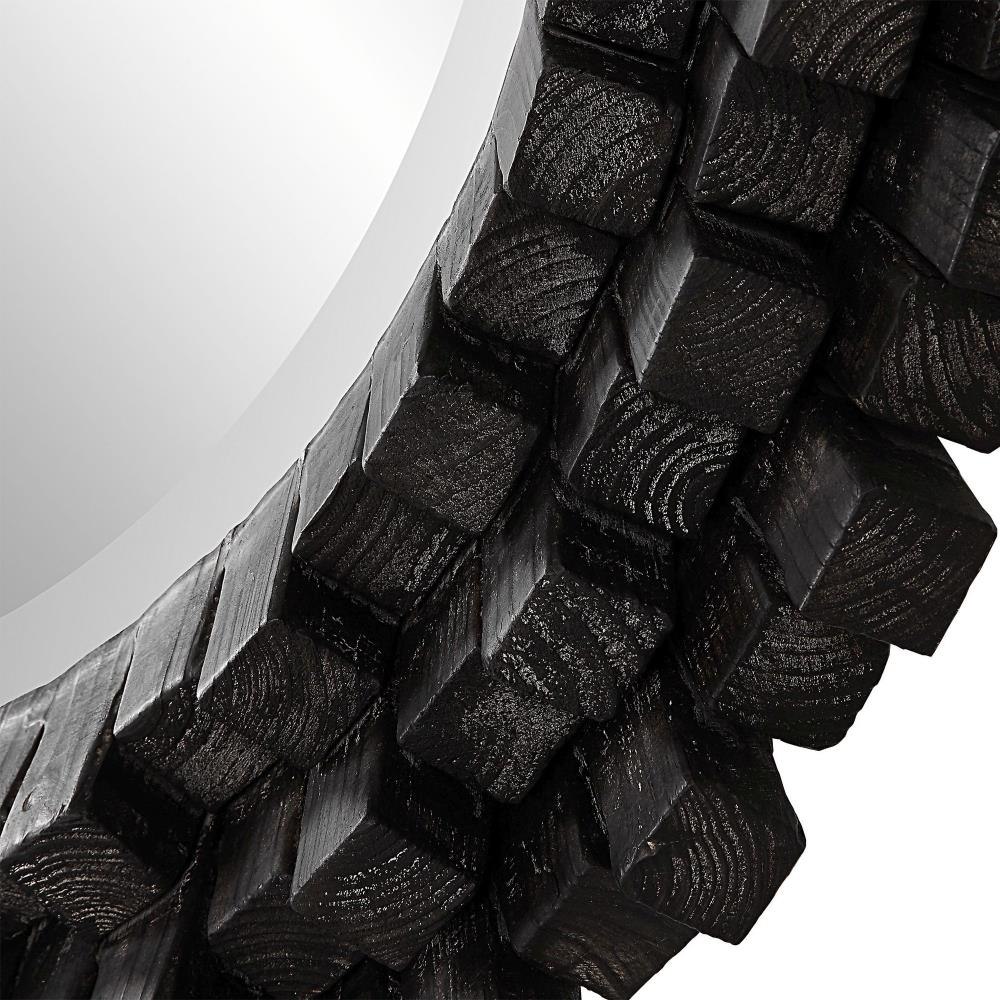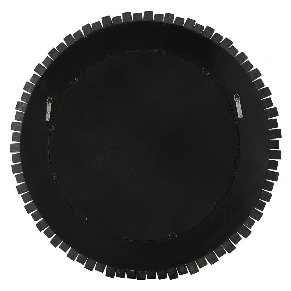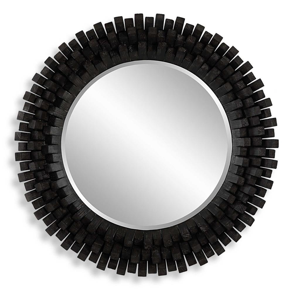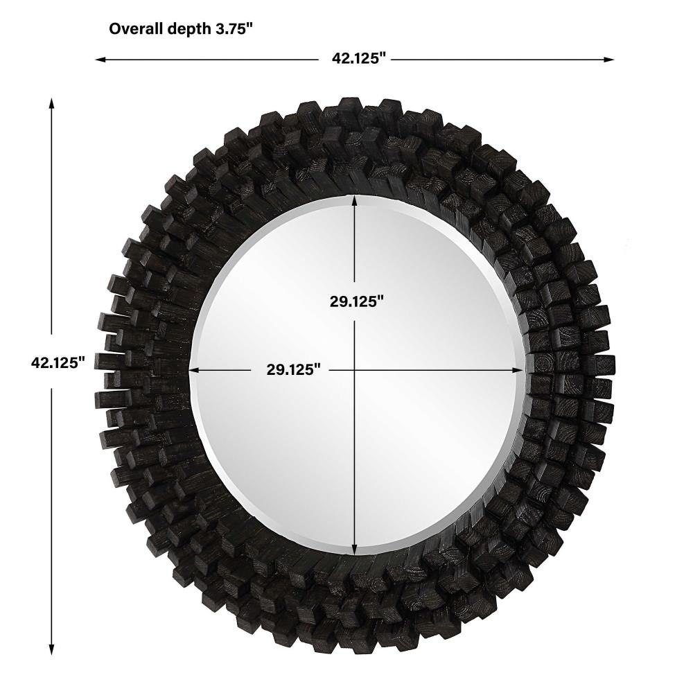 This Round Wood Mirror Has A Contemporary Rustic Flair By Featuring Angled Pillars Of Solid Wood Stacked In Alternating Heights For A Dramatic And Unique Display, Finished In An Ebony Stain With A Subtle Gray Wash. Mirror Has A Generous 1 1/4" Bevel.