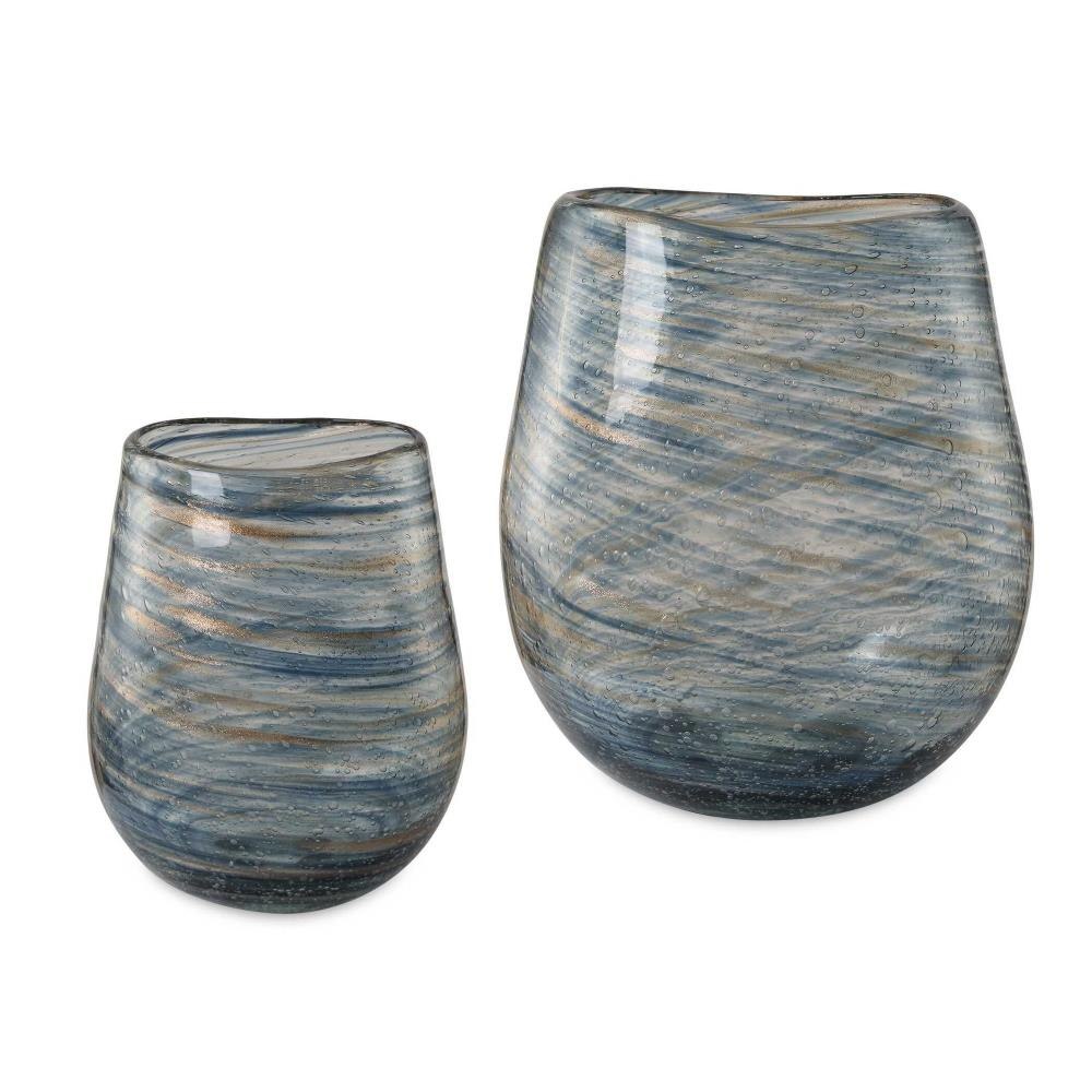 Immerse Yourself In The Mesmerizing Swirled Pattern Of Blue And Gold That Gracefully Adorns These Clear Bubble Glass Vases. The Delicate Dance Of Colors Creates A Captivating Visual Spectacle, Making These Vases A True Statement Piece Versatile Enough To Stand Alone Or To Showcase Your Favorite Blooms. Sizes: S-5x8x6, L- 7x9x8