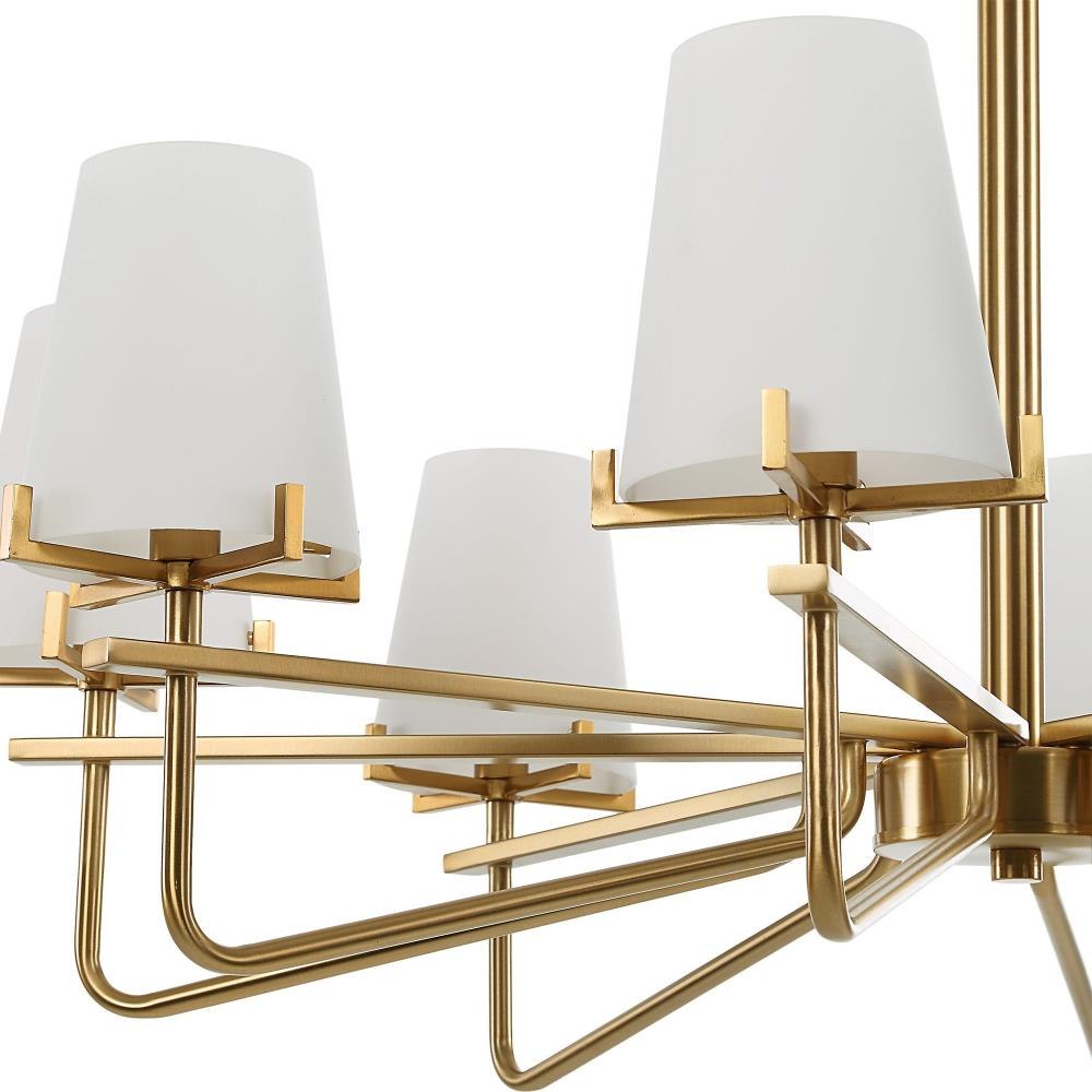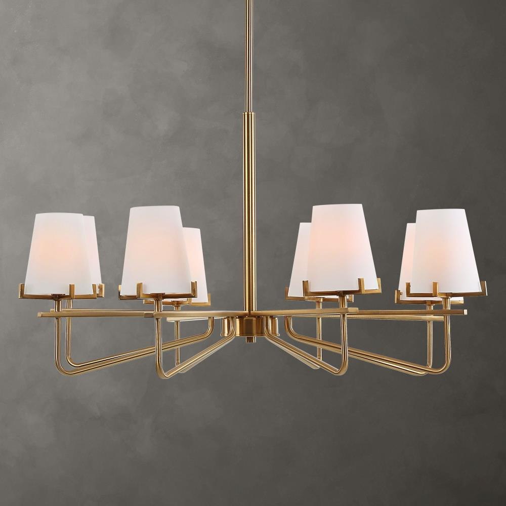 Modern Beauty With Graceful Accent Lines In A Warm Brass Finish. Arms Are Topped With Matte Opal Glass Cone Shaped Shades Giving Us A Spectacular Transitional Chandelier. 8-60 Watt Max Candelabra Sockets. Bulbs Not Included. Supplied With 20' Wire, 3-12" Stems And 1-6" Stem For Adjustable Installation.