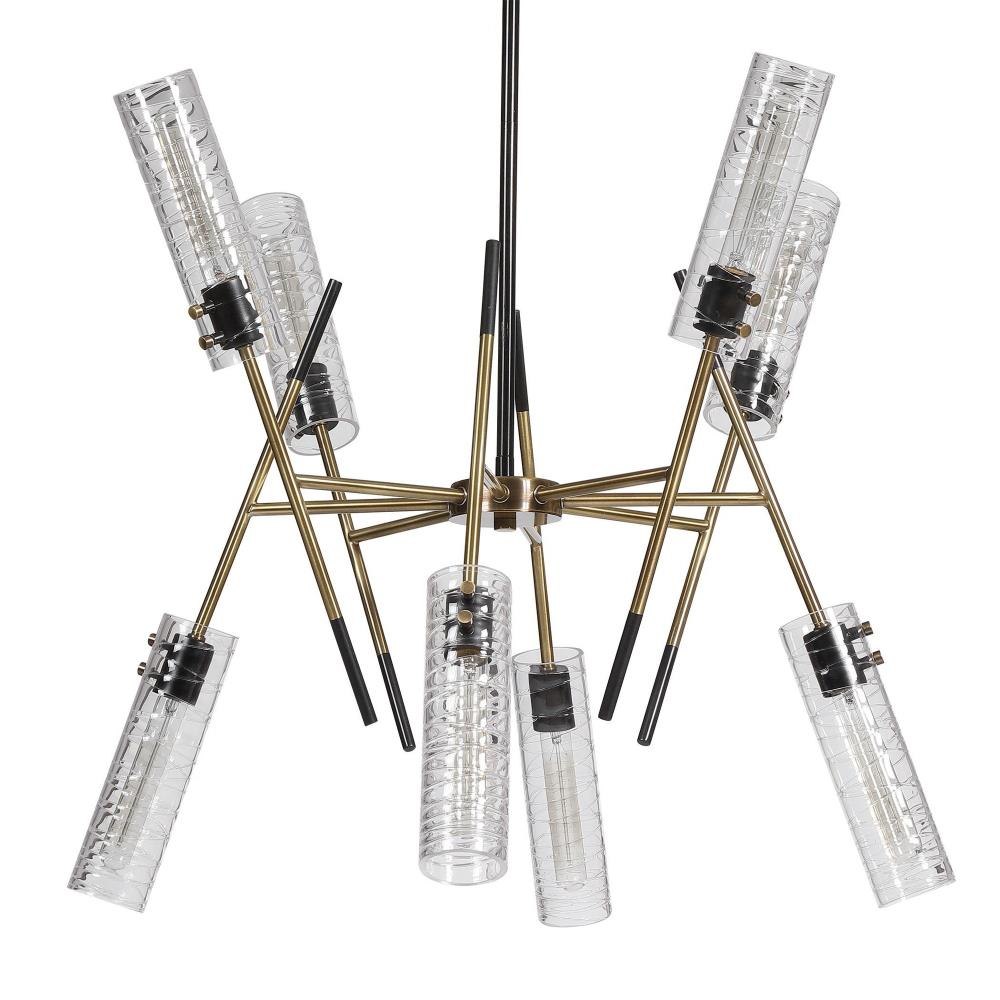 A Dramatic Soft Contemporary Look Blends Straight Lines And Linear Glass To Give Us This Eye Catching 8 Lt Pendant. Featuring A Combination Finish Of Texture Black & Antique Brass Complimenting The Narrow Clear Cylinders Of Glass With Unique Swirled Thread Accents. 8-60 Watt Max, Edison Sockets. Supplied With 15' Wire, 3-12 Inch Stems, And 1-6 Inch Stems For Adjustable Installation.
