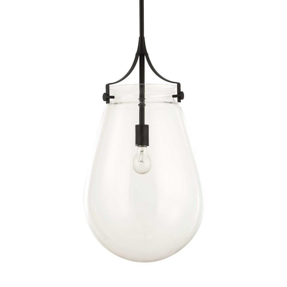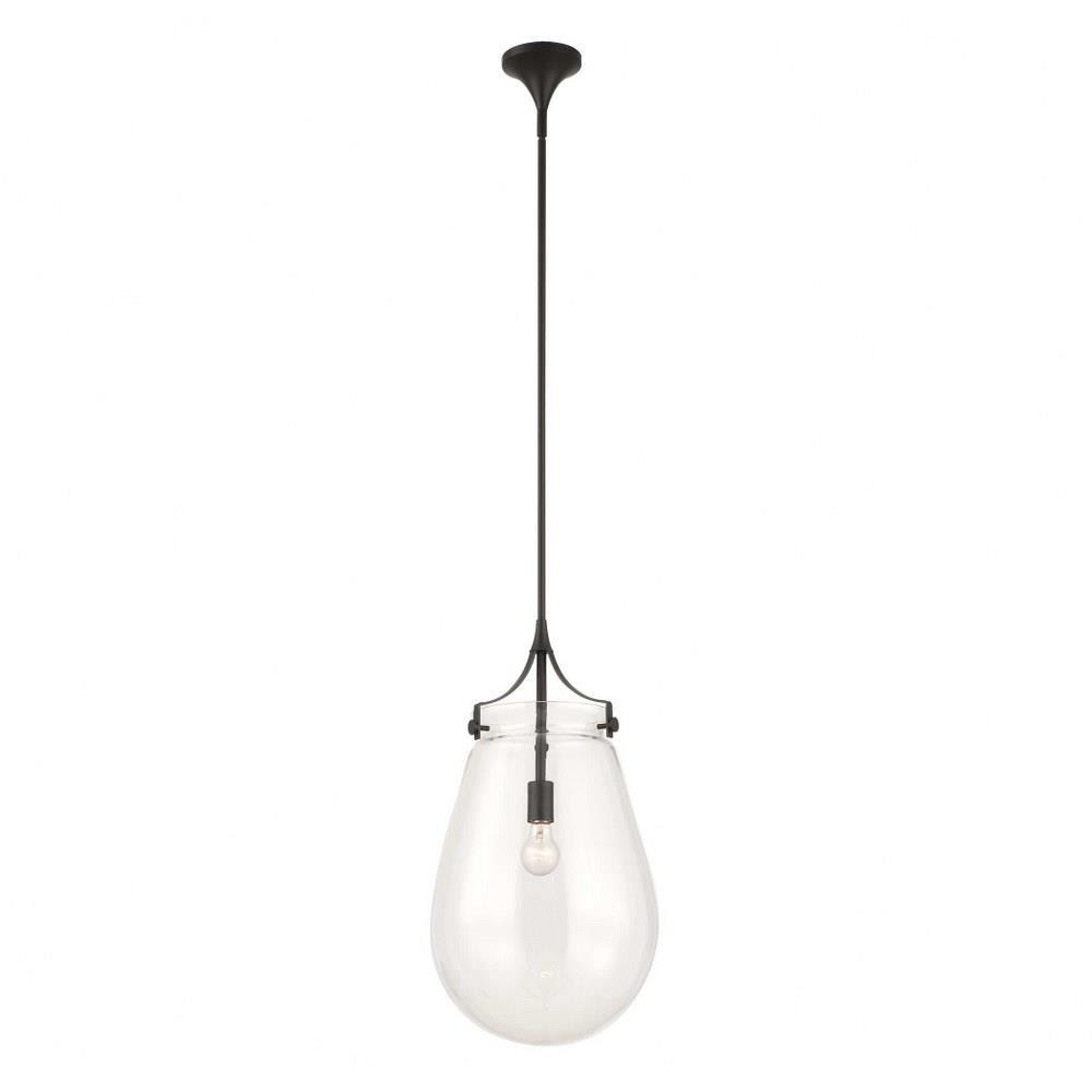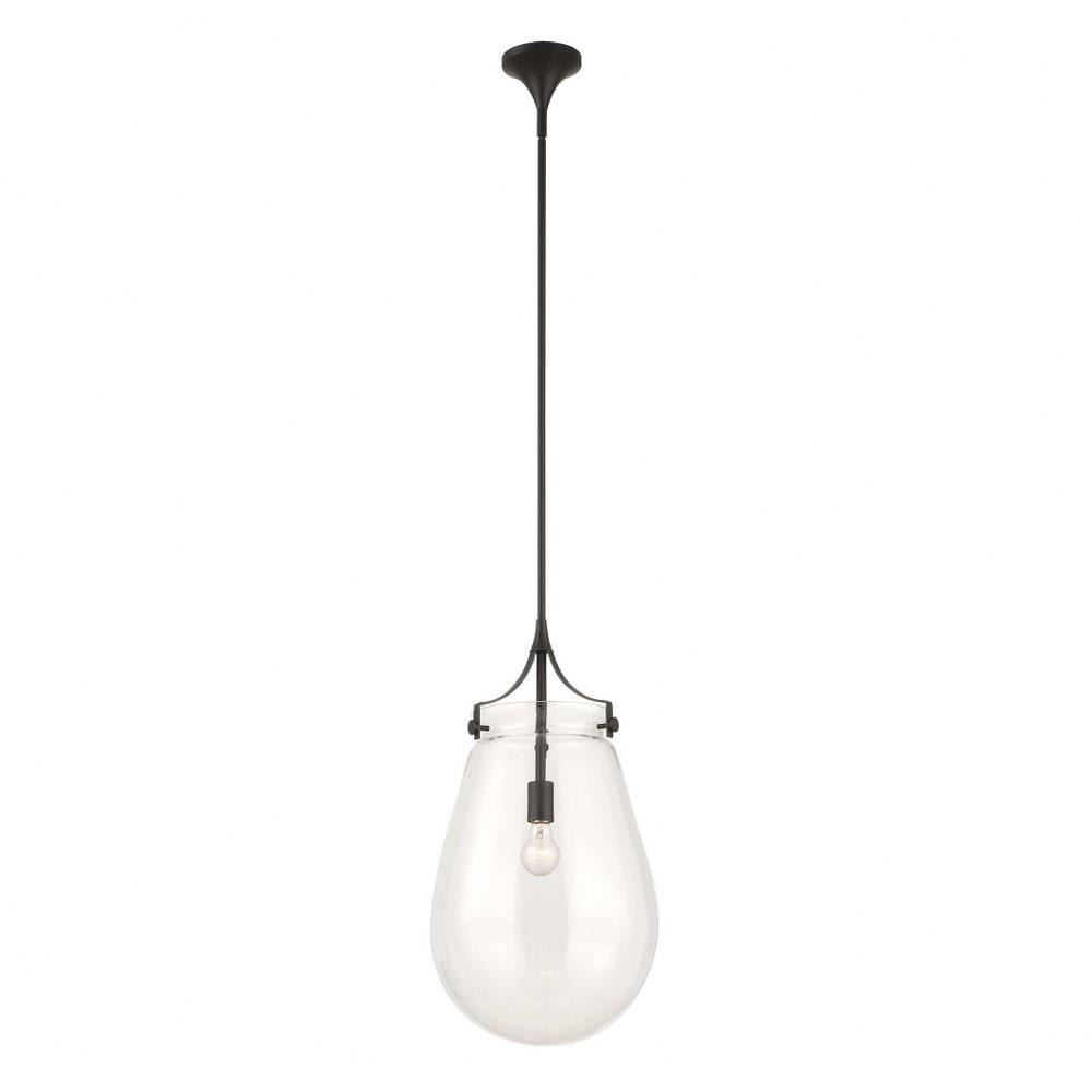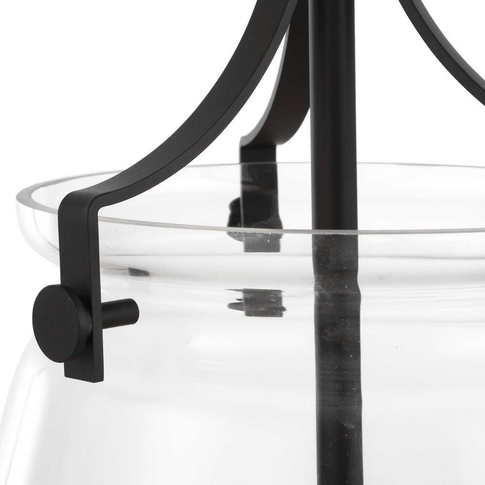 A Floating Oversized Clear Glass Pendant That Features Architectural Cone Draped Arms And Accents In A Rich Matte Black Finish. 1-60 Watt Max Edison Socket. Bulbs Not Included. Supplied With 15' Wire, 3-12" Stems And 1-6" Stem For Adjustable Installation.