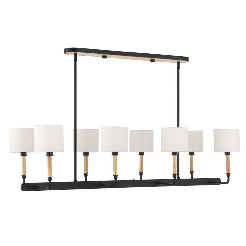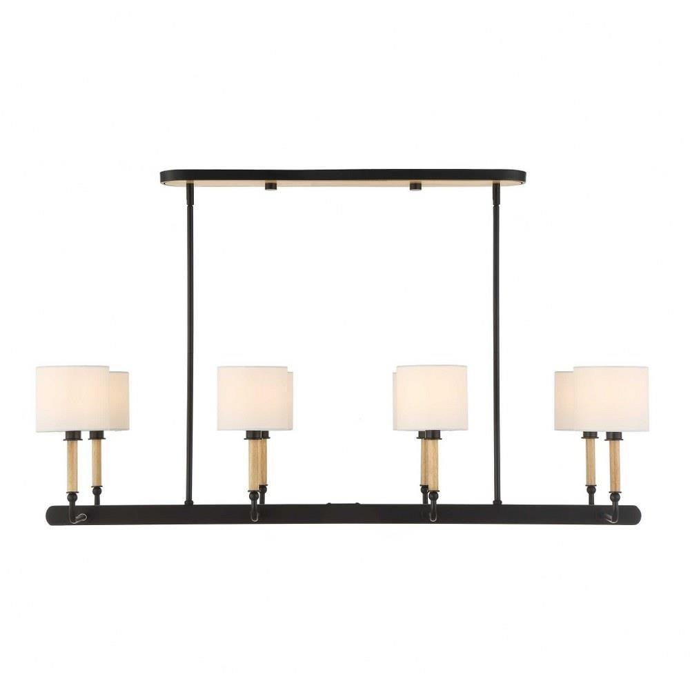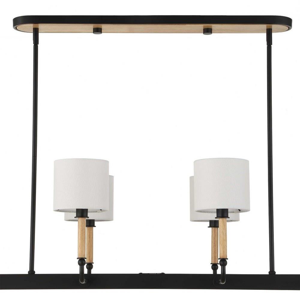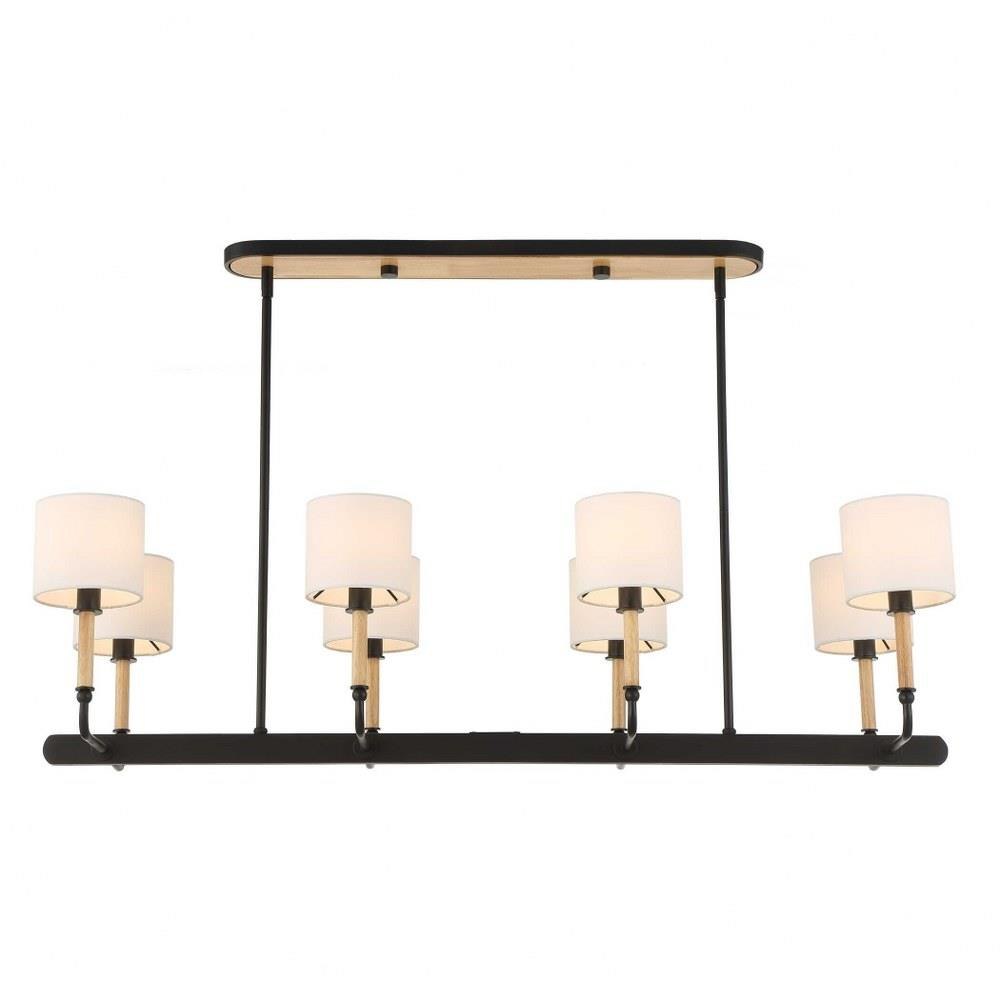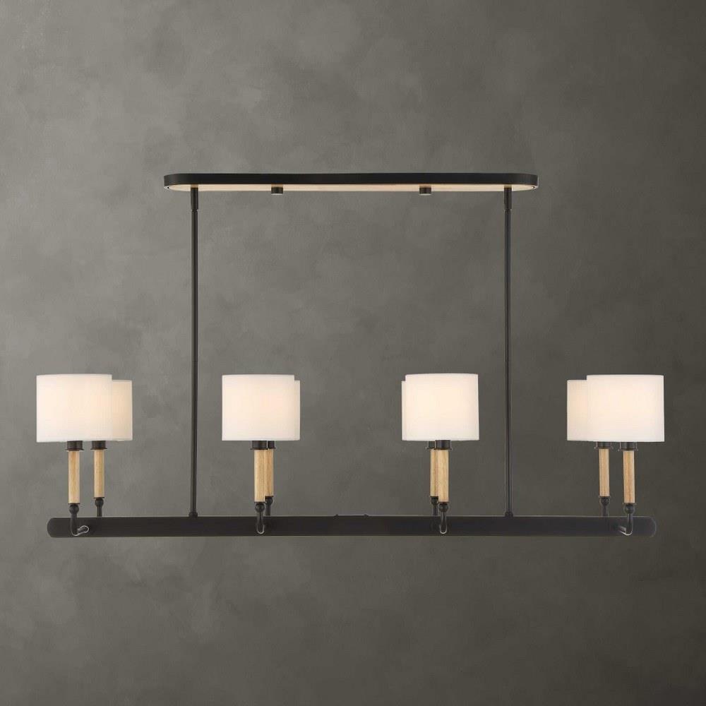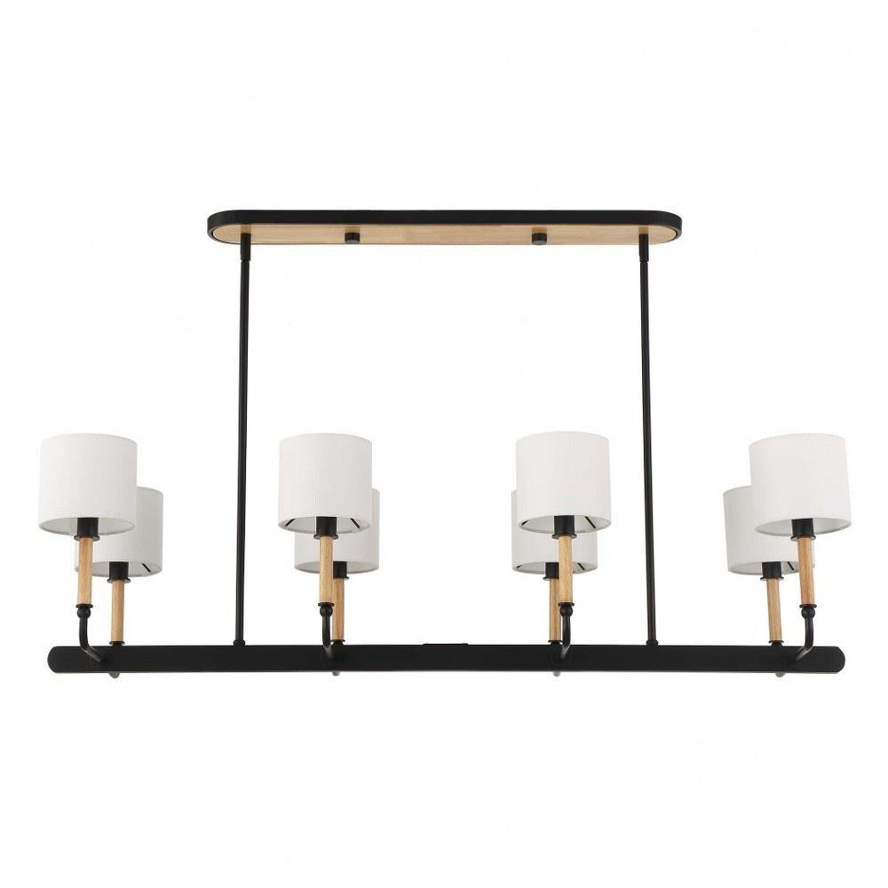 This Casual 8 Light Linear Pendant Blends Into Any Style With Classic Lines, Earthy Blond Wood Accents And A Matte Black Finish. All Topped With A White Linen Fabric Shades. 8-25 Watt Max Candelabra Sockets. Bulbs Not Included. Supplied With 15' Wire, 6-12" Stems And 2-6" Stem For Adjustable Installation.