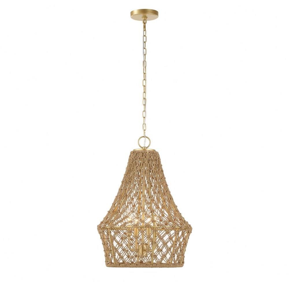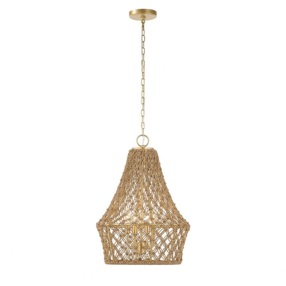 Natural Beige Rope Is Knotted And Tied By Hand In A Decorative Pattern Over A Metal Frame Dressed Up With A Brushed Gold Finish. 4-60 Watt Max Candelabra Sockets. Bulbs Not Included. Supplied With 15' Wire, 5' Chain For Adjustable Installation.