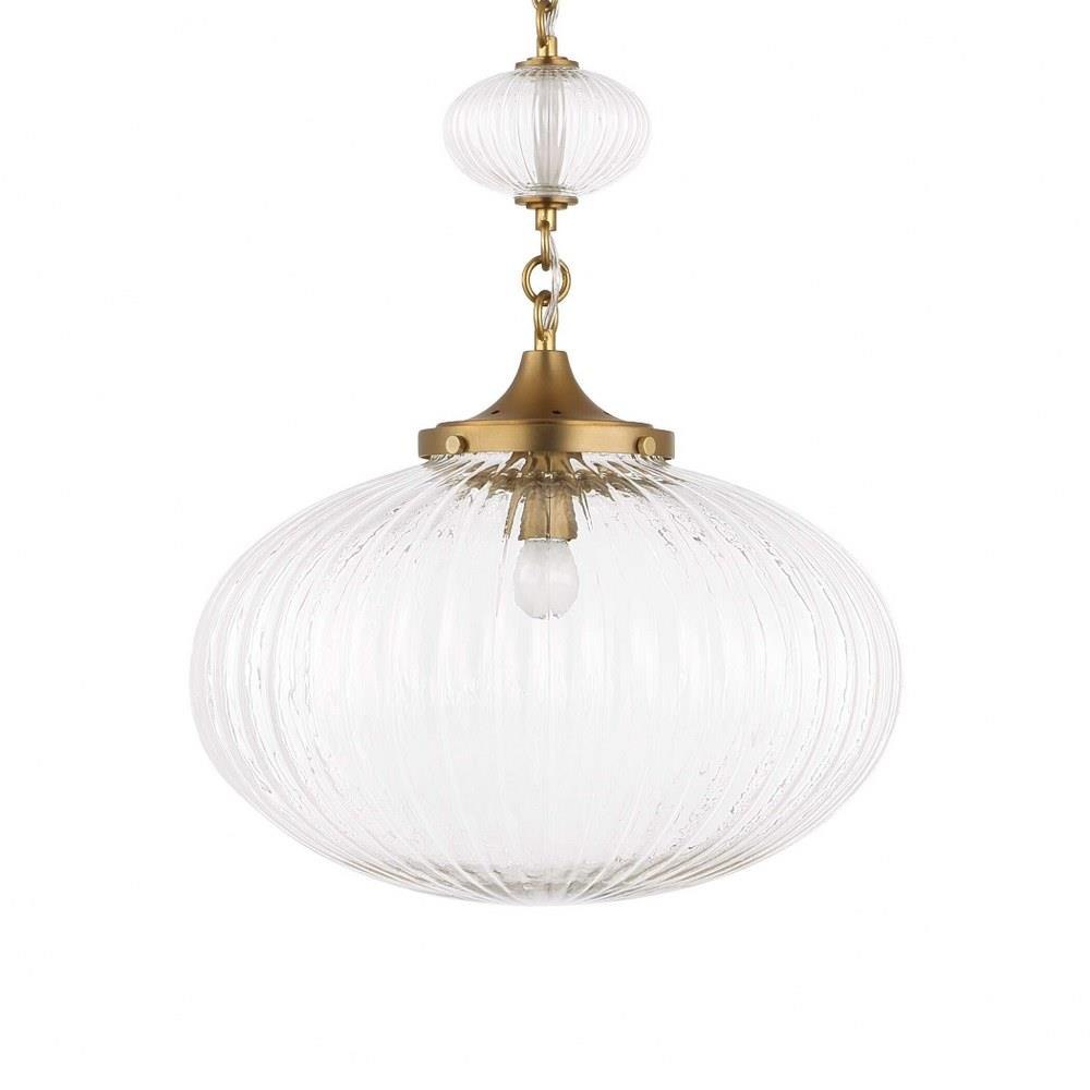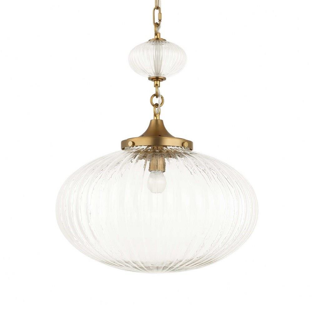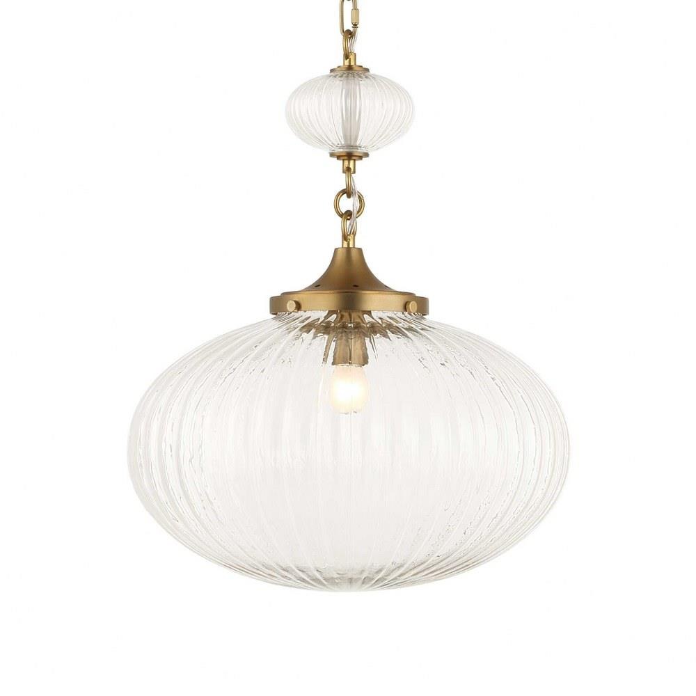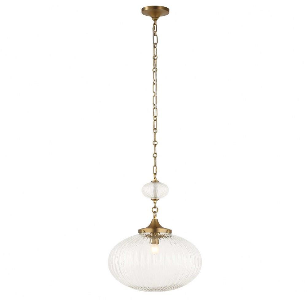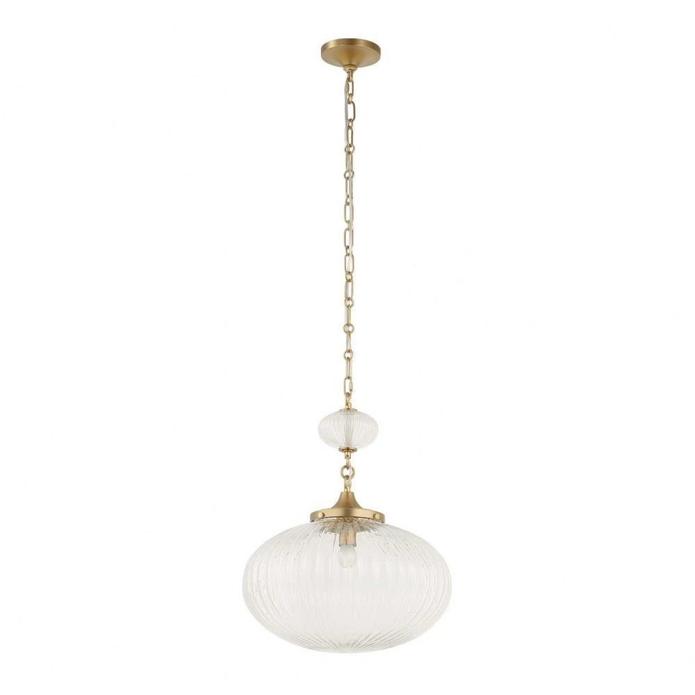 Our 1 Lt Pendant With Clear Puffy Melon Glass Shade And Accent Is Enhance With A Matte Brushed Gold Finish. Featuring A Decorative Canopy And Special Patterned Chain. 1-60 Watt Max Edison Socket. Bulb Not Included. Supplied With 15' Wire, 5' Chain For Adjustable Installation.