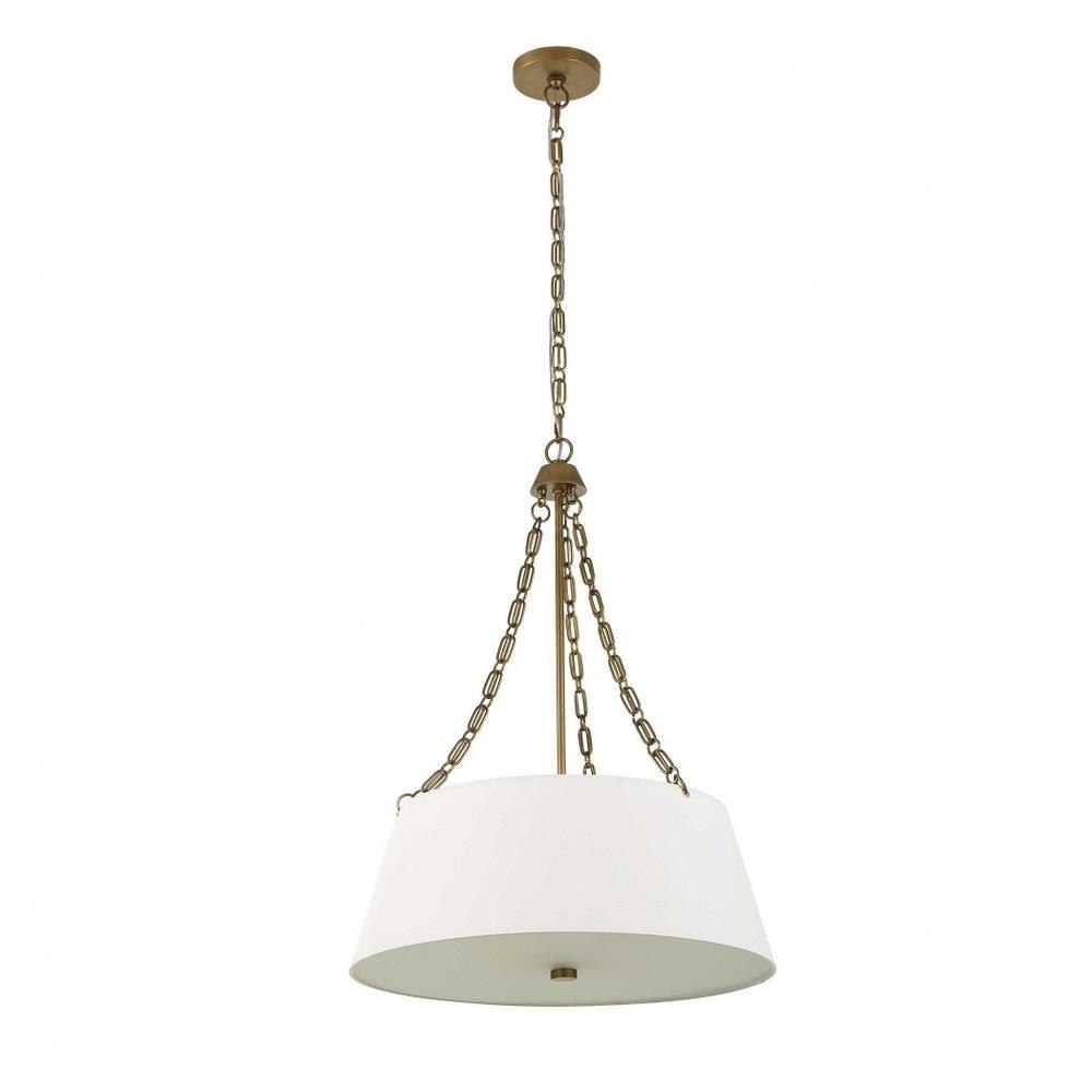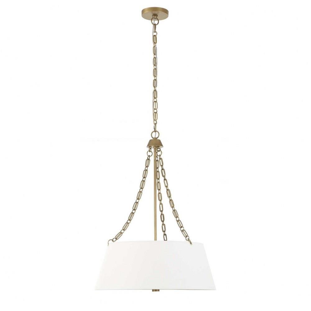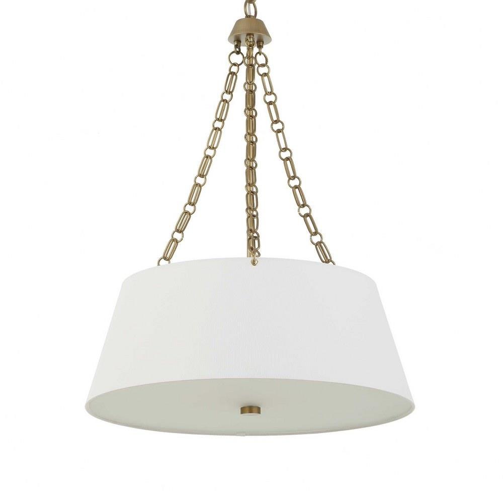 White Linen Hanging Shade With Custom Double Oval Link Chain Details Finished In A Matte Brushed Gold Finish With A Lower White Glass Diffuser. 4-60 Watt Max, Edison Sockets. Bulbs Not Included. Supplied With 15' Wire, 5' Chain For Adjustable Installation.