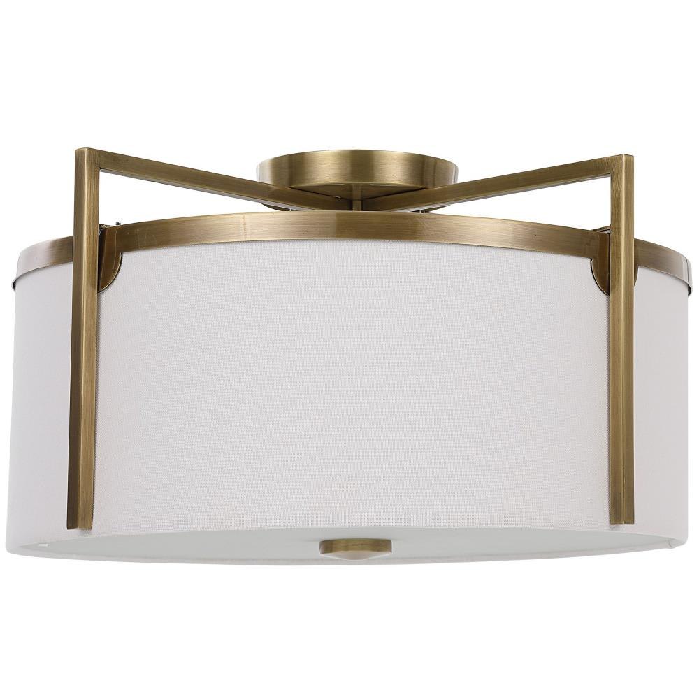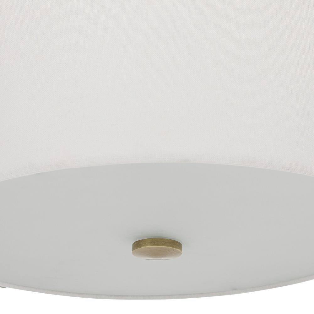 Chic And Versatile With Clean Lines This 3 Lt. Semi Flush Mount Features An Antique Brass Finish With Off White Linen Hard Back Shade With A Central Frosted Glass Diffuser. 3-100 Watt Max Edison Sockets.