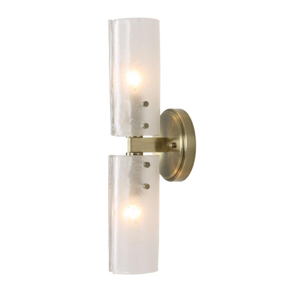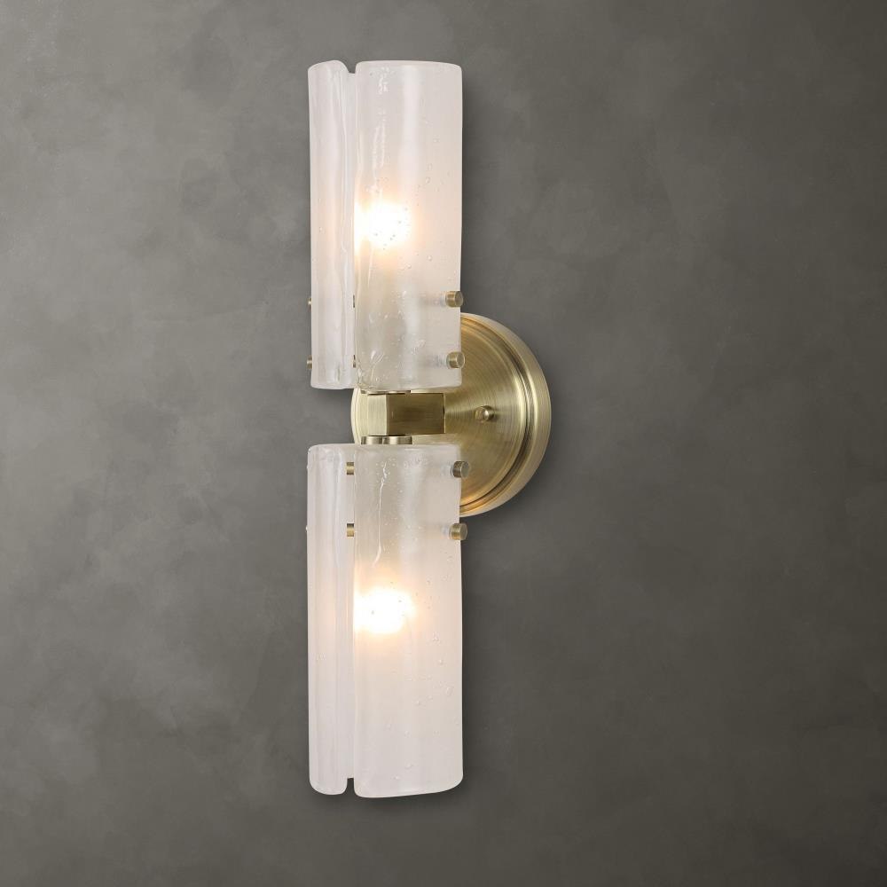 Two Handmade Glass Panels Of Translucent White Seeded Glass Complete Each Shade Of This Opulent Sconce With An Antique Brass Finish. 2-60 Watt Max Candelabra Sockets. Bulbs Not Included. Mount Either Vertical Or Horizontal For Upmost Flexibility.
