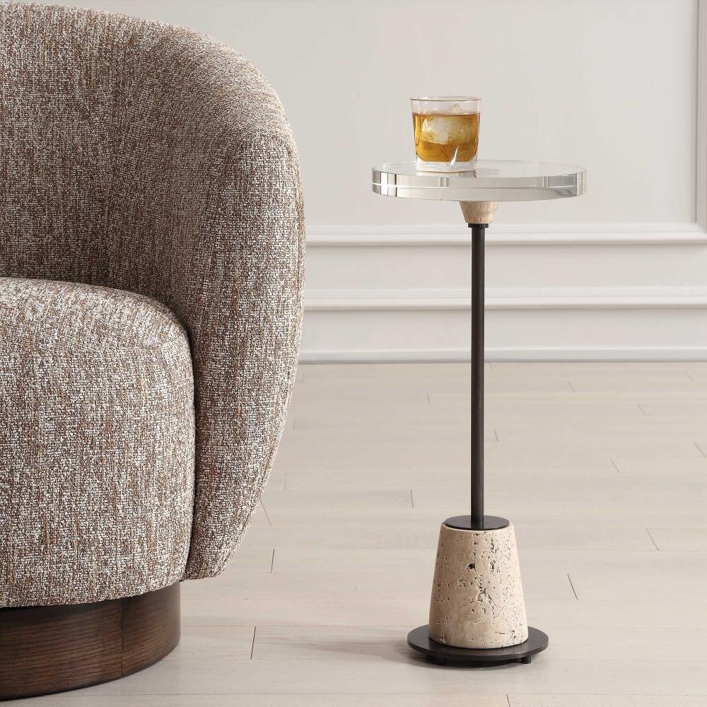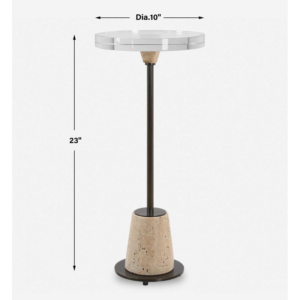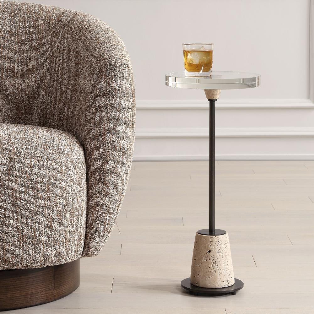The Aurthur Accent Table Features A Thick Crystal Top, Honed And Unfilled Travertine, Paired With Bronze Finished Iron. The Fusion Of These Elements Has Given This Table An Organic And Sophisticated Aesthetic Ready To Enhance Any Room.