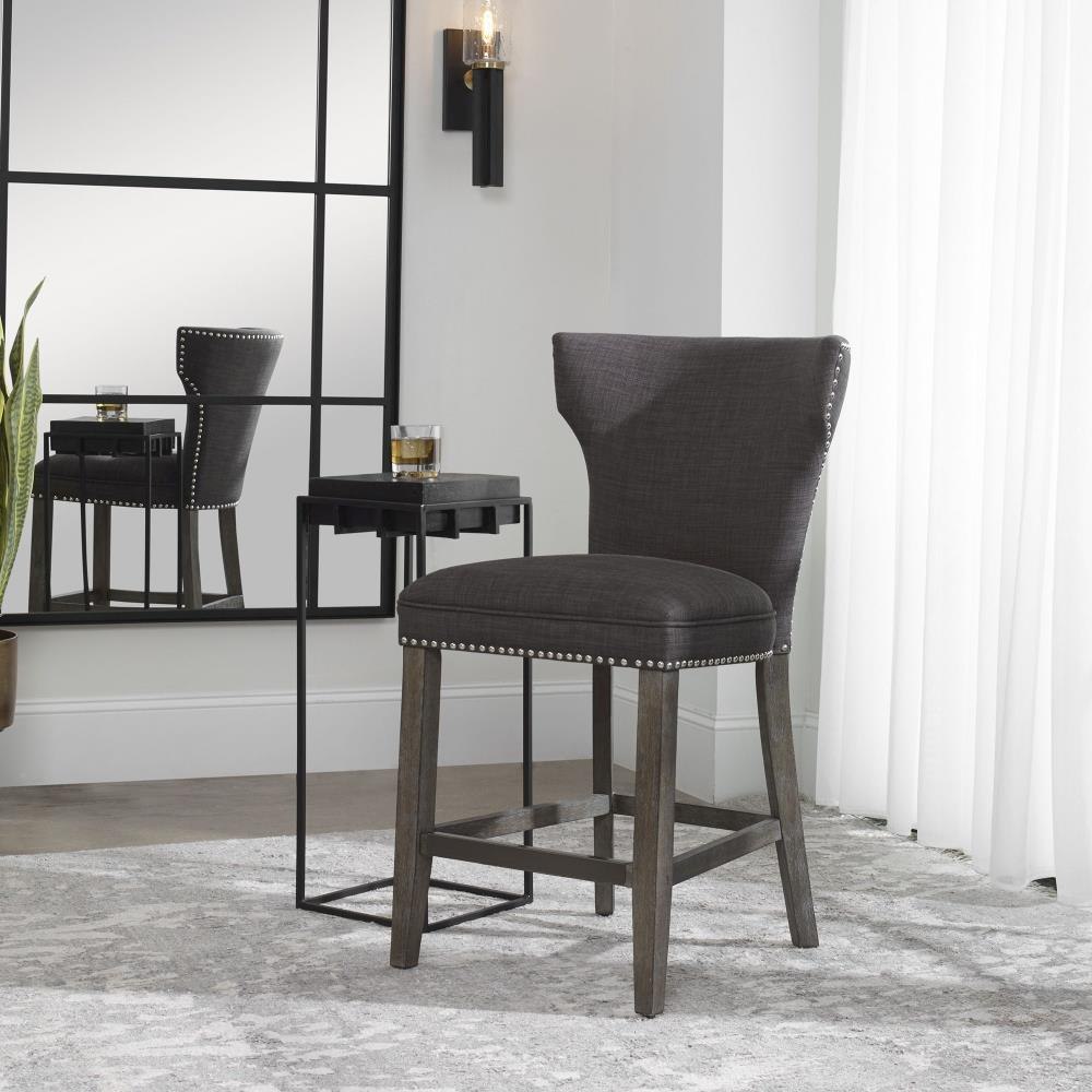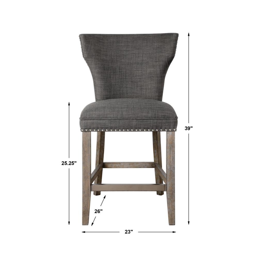 Supportive Comfort In A Curved Back Design, Covered With Warm Charcoal Gray Linen And Accented By Polished Nickel Nail Head Trim. Honey Stained Frame Is Finished With Heavy Gray Wash, With An Antique Brass Finished Kick Plate. Seat Height Is 25".