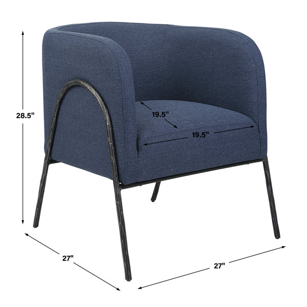 Inspired by Scandinavian designs, this barrel-back style chair showcases elegant curved lines with a chiseled iron frame in a natural aged black iron finish. A casual blue denim polyester fabric accents this modern look.