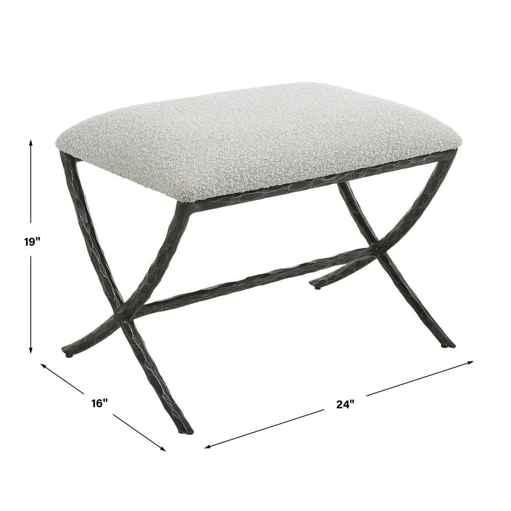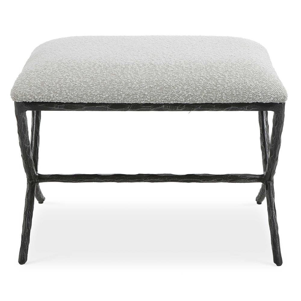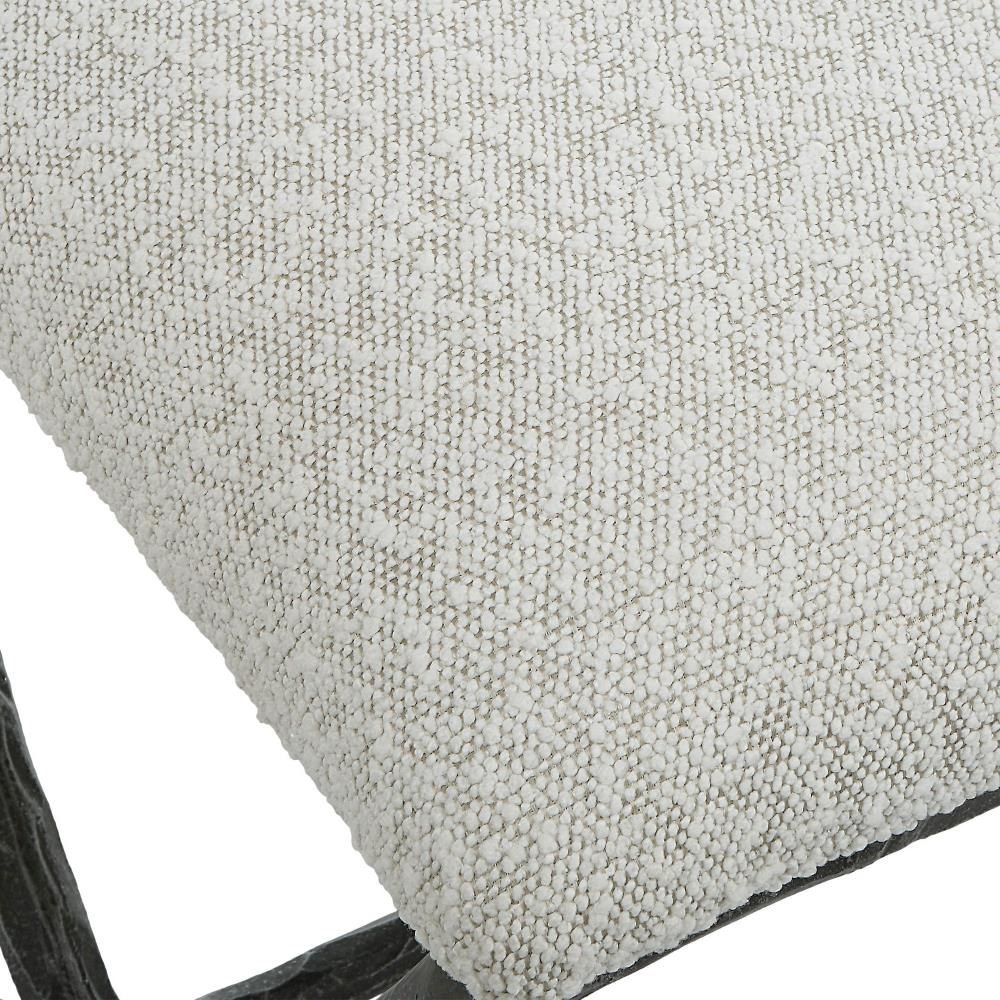 With Clean Contemporary Lines, This Cast Iron Base Features A Chiseled Texturing With A Distressed Charcoal Finish. Topped With An Upholstered Seat In A Casual Ivory And Warm Gray Boucle Fabric.