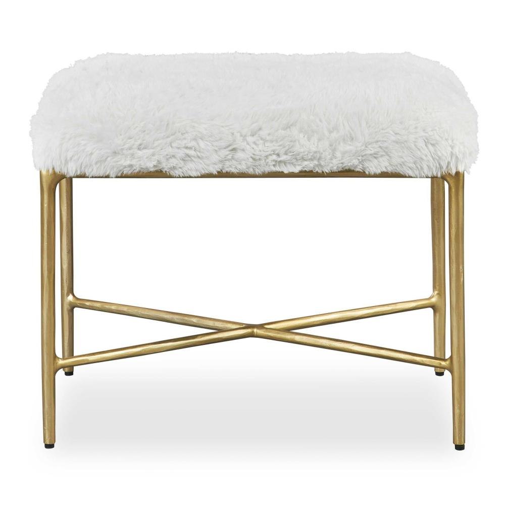 A Textural Glam Accent Featuring A Lush Long-haired Faux Sheepskin In Cream Paired With A Solid Wrought Iron Base With Chiseled Texturing Finished In Soft Gold.