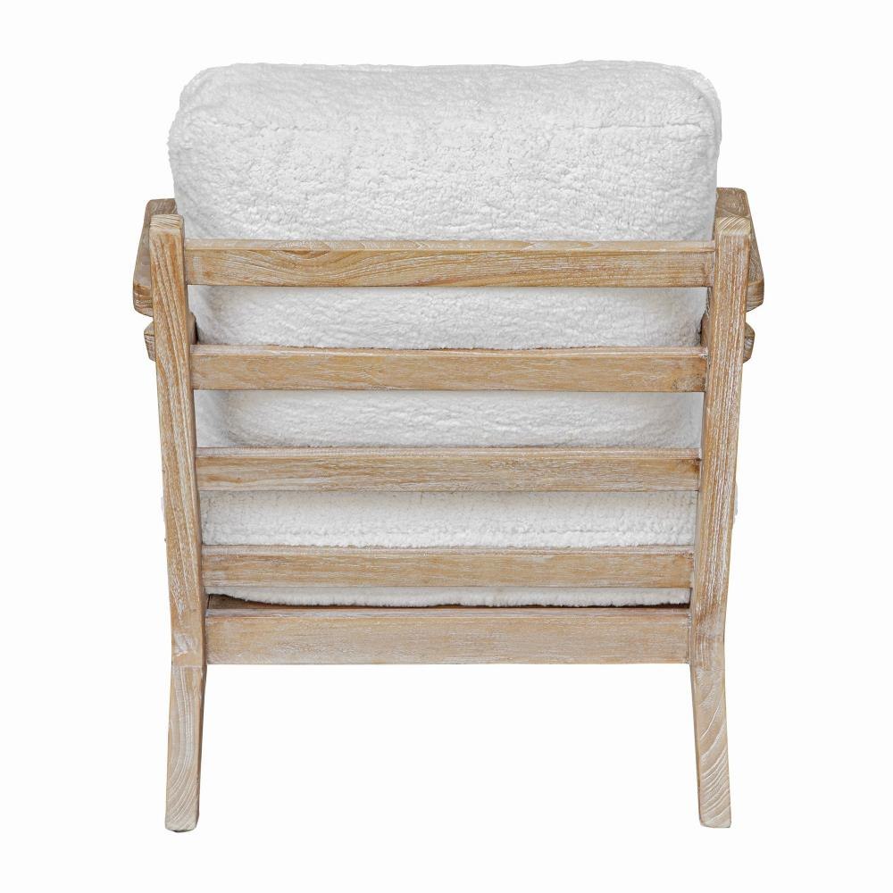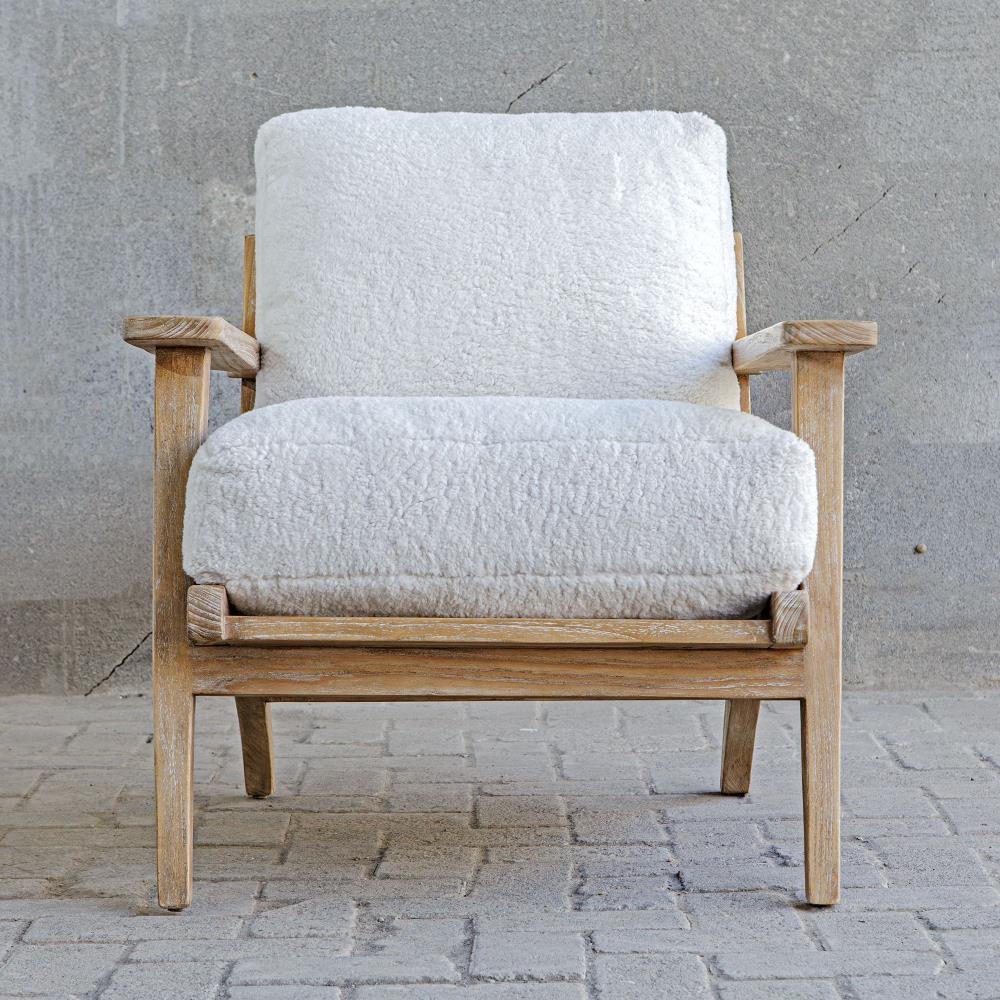 Relax In The Laid Back Lounge Chair, Solidly Constructed From Mindi Wood In A Natural Finish. Plush Cushions Are Upholstered In An Ultra Soft, White Faux Sheepskin Fabric. Seat Height Is 20".