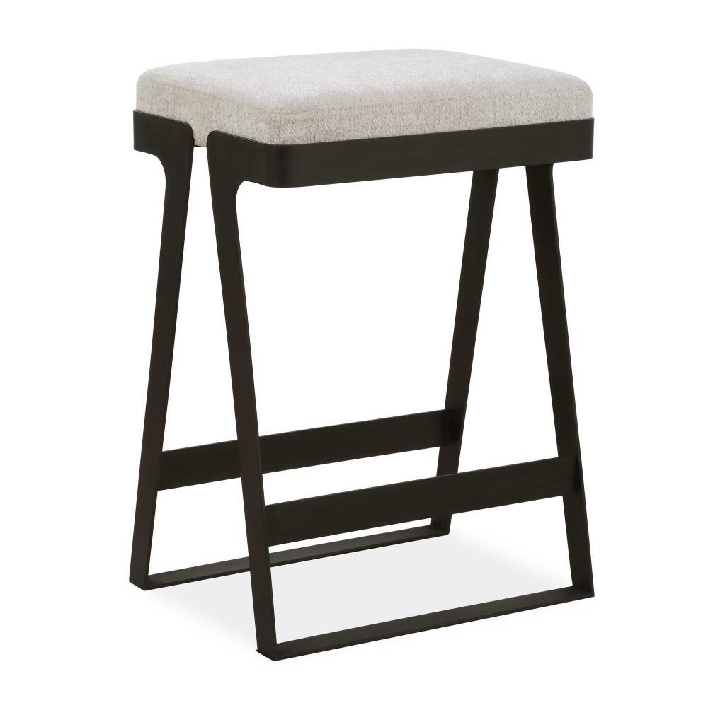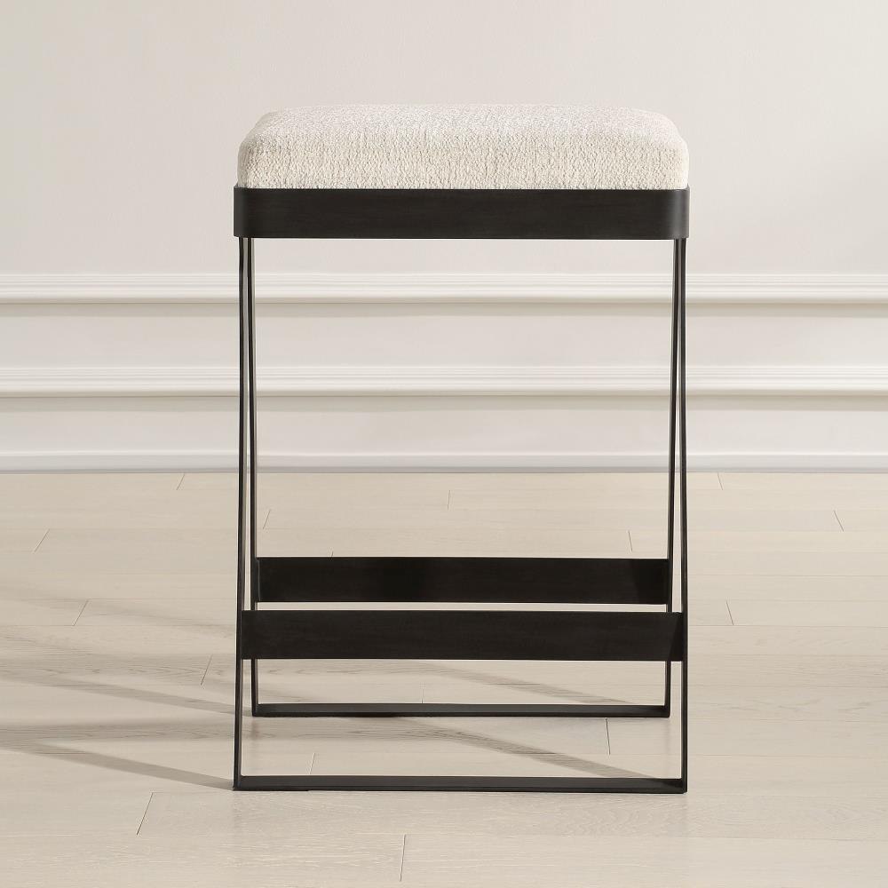 The Modern Hover Counter Stool Is Streamlined With An Aged Black Curved Iron Base And Cushioned Seat. Upholstered In An Ivory Chenille Boucle Performance Fabric.