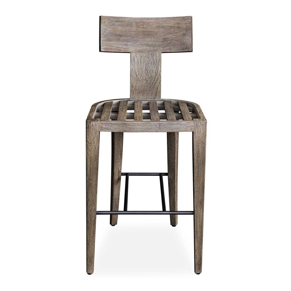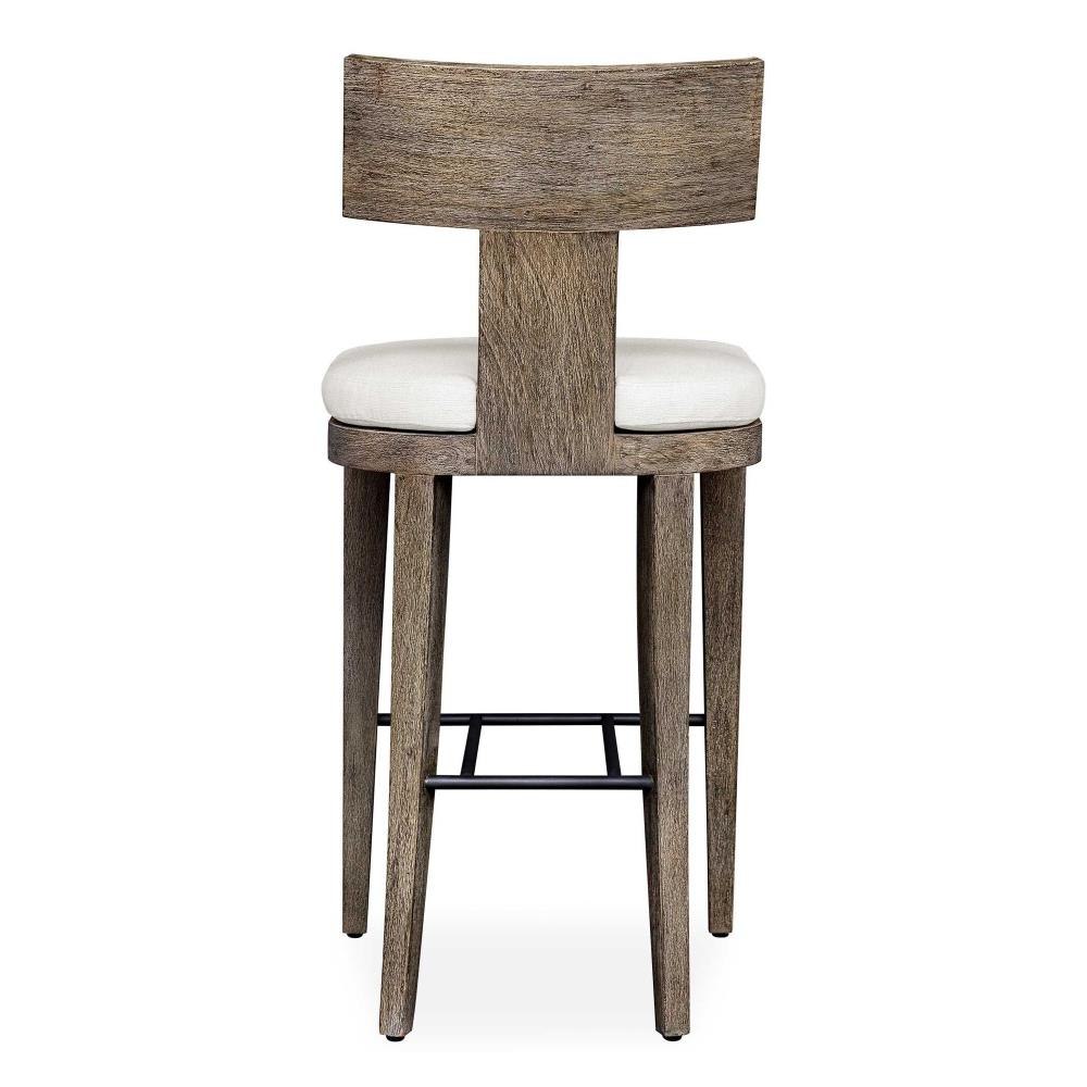 With Durability For The Outdoors In Mind, The Cellini Bar Stool Features A Gracefully Curved Mahogany Wood Frame In A Weathered Gray Finish With Wire-brushed Details. The Plush Cushion Is Upholstered In Oyster White Solution Dyed Acrylic Fabric That Is Constructed To Withstand The Moisture And Dirt That Comes With Outdoor Use.