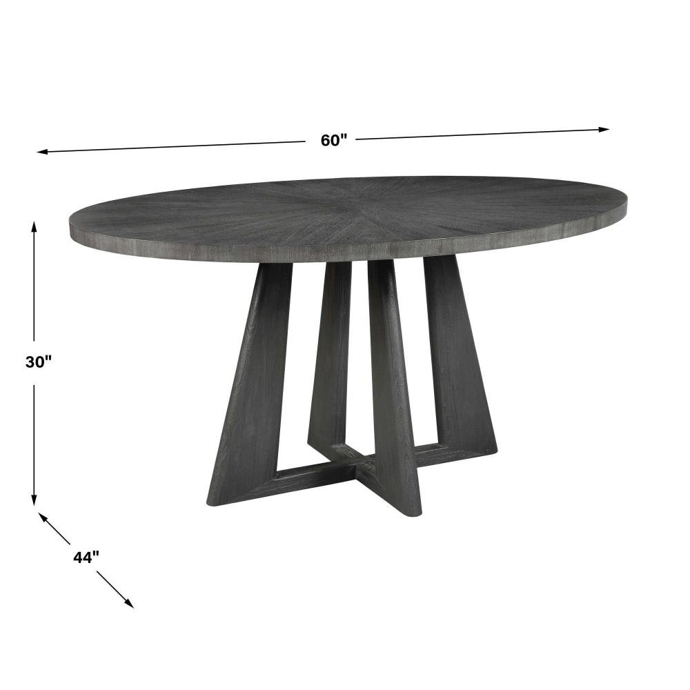 Full Of Contemporary Versatility, This Dining Table Features A Rich Acacia Veneer Top In Dark Walnut Stain Washed With A Light Gray Glaze. Rounded Legs In Solid Acacia Enhance The Beauty Of The Sunburst Oval Top. Solid Wood Will Continue To Move With Temperature And Humidity Changes, Which Can Result In Cracks And Uneven Surfaces, Adding To Its Authenticity And Character.