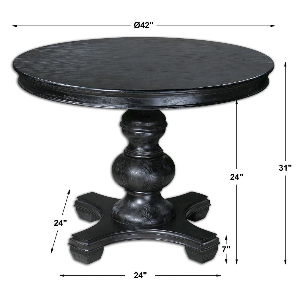 An Elegant Entryway Table Or Small Dining Table, Featuring Detailed Moldings And A Stylish Turned Baluster In A Satin Black Finish With Subtle Pine Wood Grain.