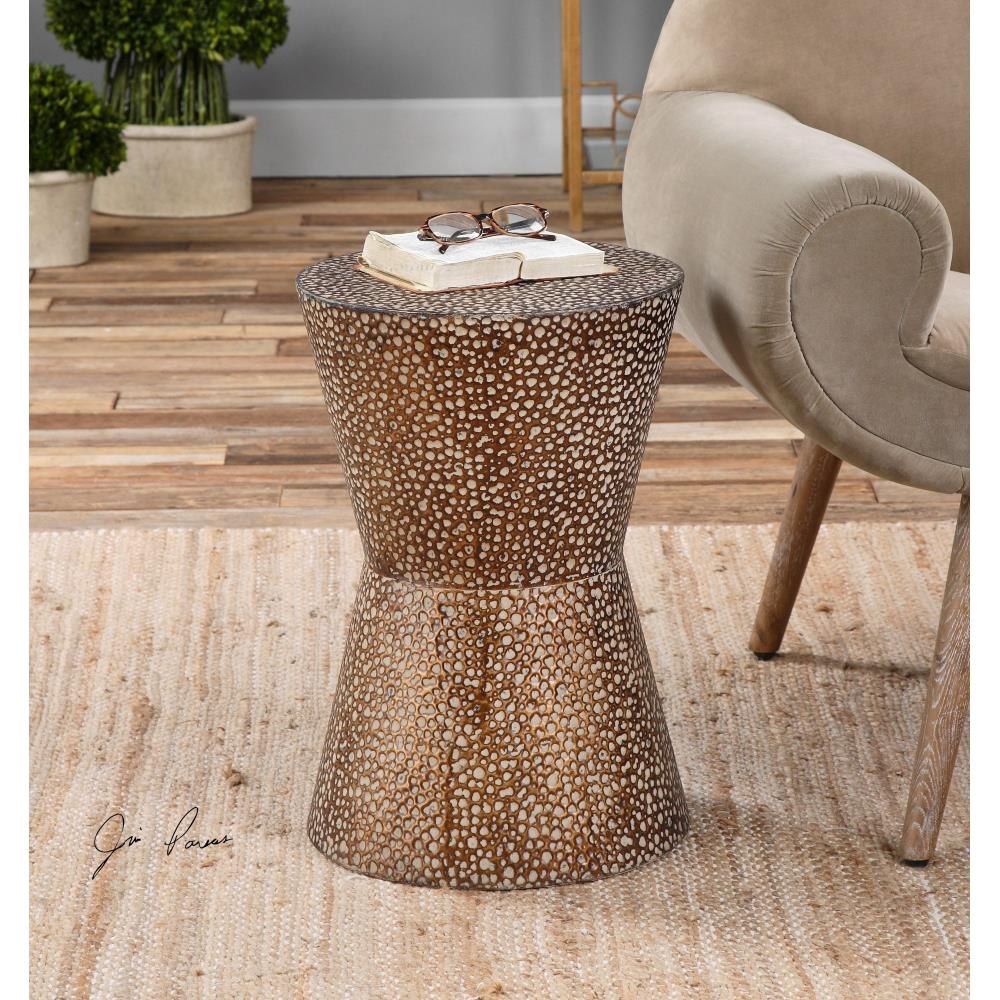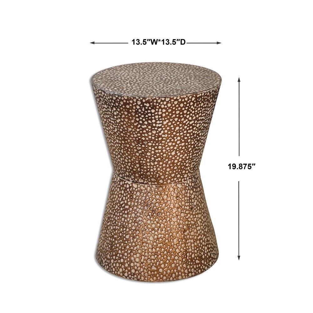 Hammered Metal, Drum Shaped, Side Table In Antiqued, Copper Bronze With Dusty Stone Glaze.