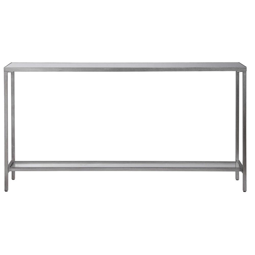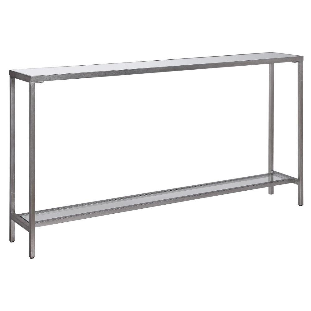 Classic And Minimalistic, This Narrow Iron Console Table Is Finished With Lightly Antiqued Silver Leaf, Inset With A Beveled Mirrored Top, And Gallery Shelf In Clear Glass.