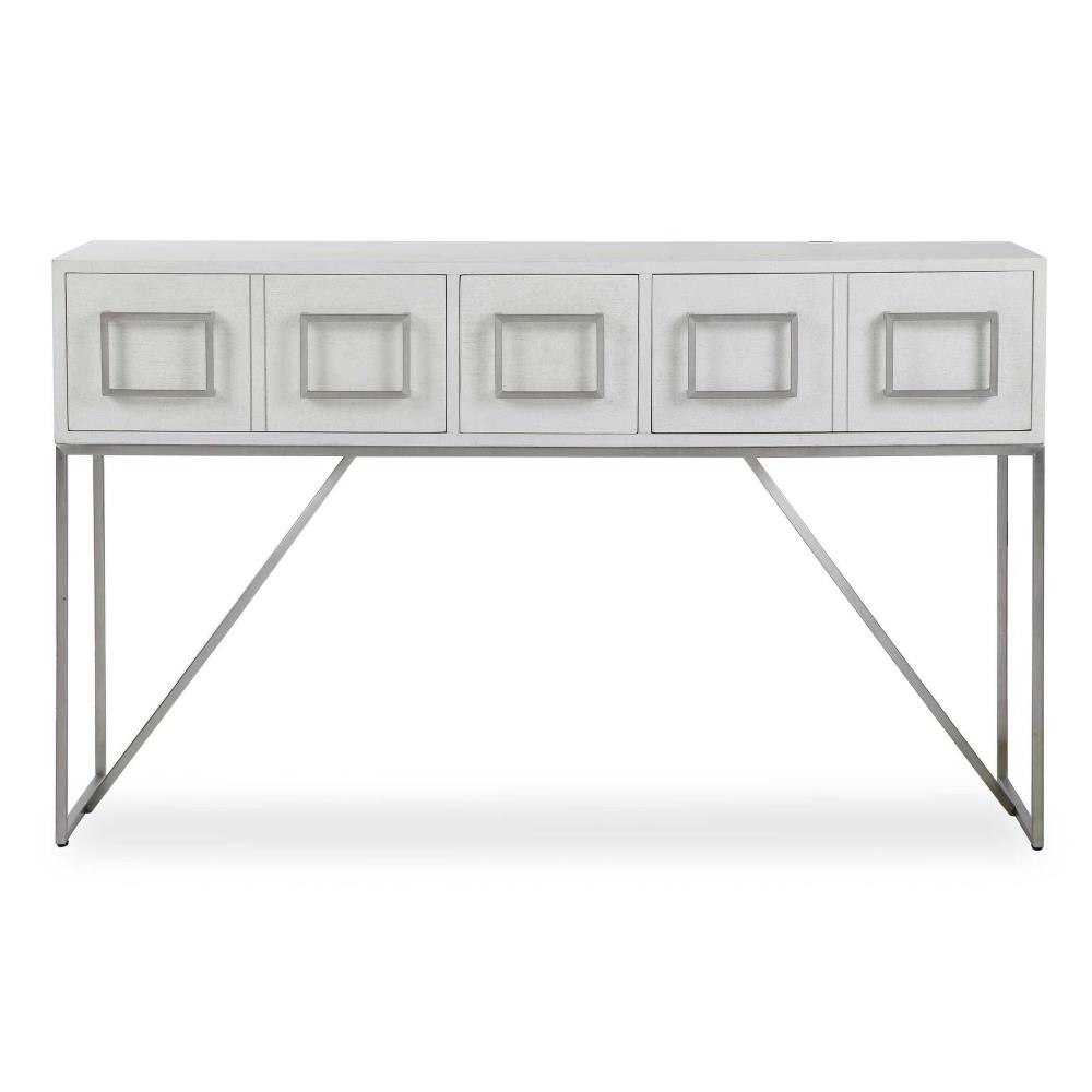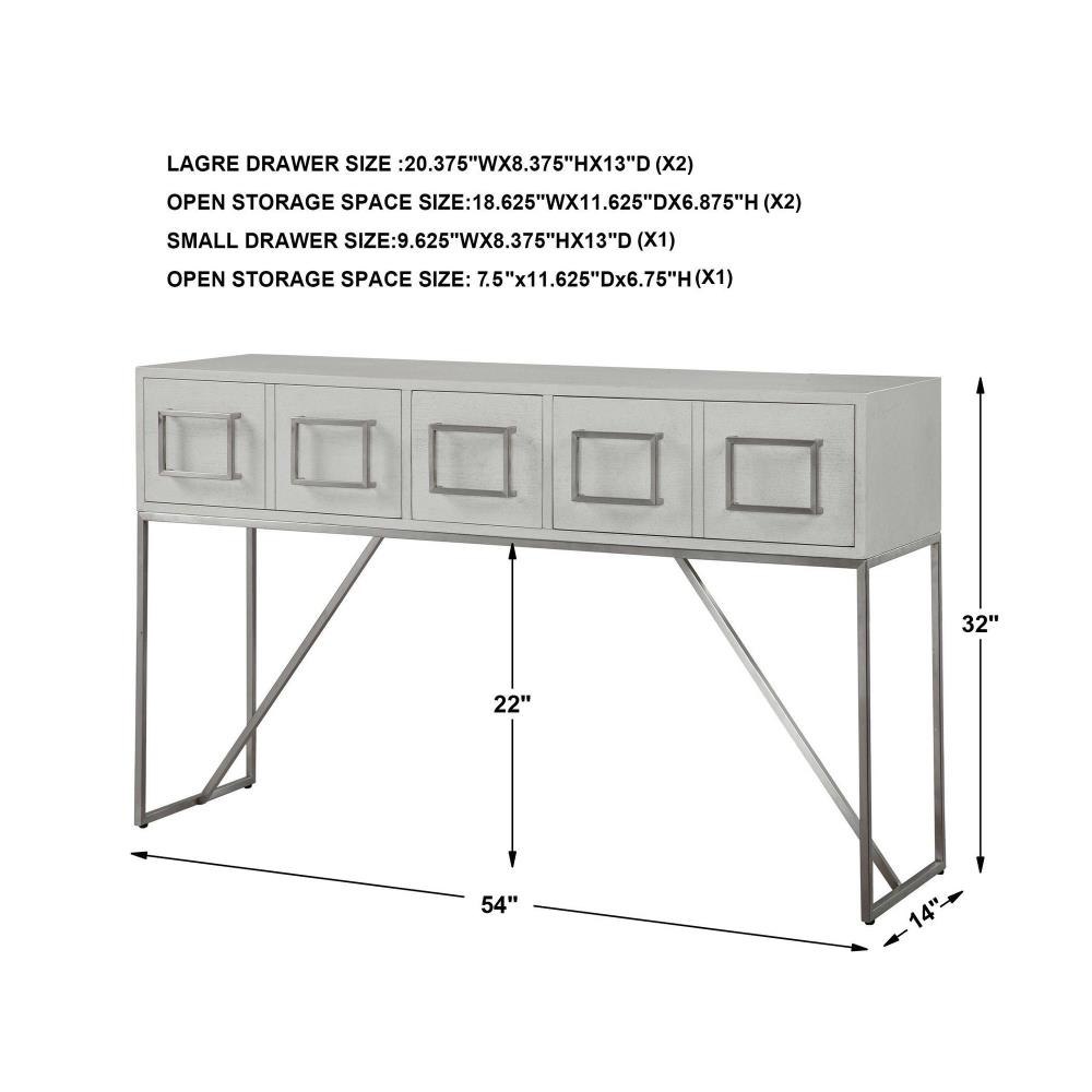 Clean Contemporary Styling, Featuring Oak Veneer Finished In A Soft White With Light Gray Distressing. Accented With Statement Hardware In Brushed Nickel Stainless Steel With A Coordinating Base. Has Two Double Drawers And One Single Drawer In The Center.
