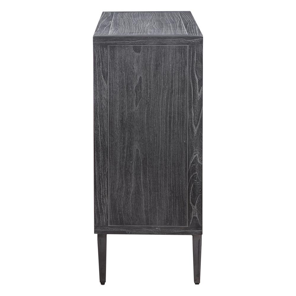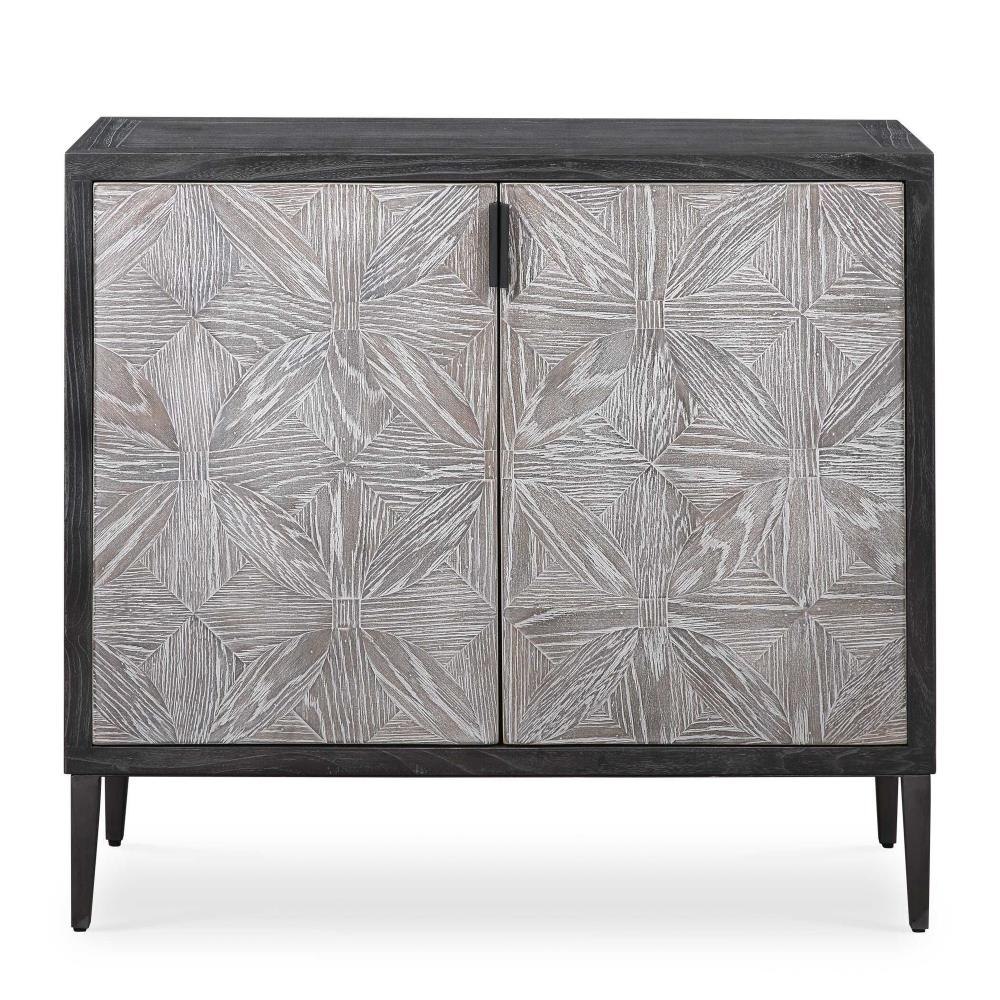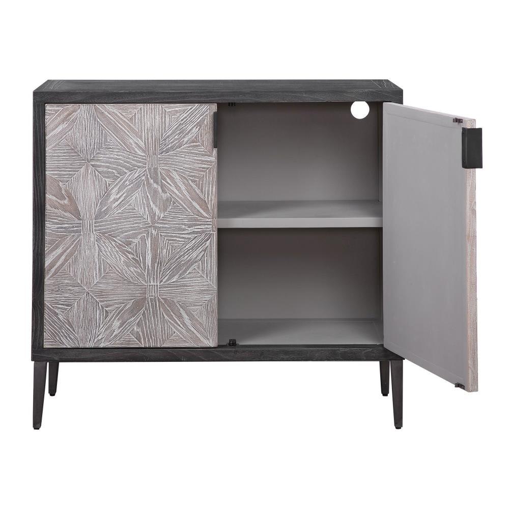 Showcasing A Modern Lodge Style, This Two Door Cabinet Features Hand Pieced Mosaic Doors In Oak Veneer Finished In Light Gray, With A Contrasting Elm Veneer Exterior Finished In Deep Black With Light Gray Glazing. Accented With Solid Iron Hardware And Legs In Aged Black. Has Two Interior Adjustable Shelves.