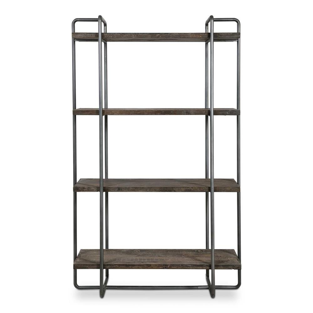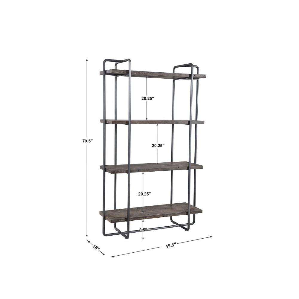 Exhibiting An Urban Industrial Feel, This Etagere Features A Steel Frame Finished In Dark Brushed Pewter. The Four Floating Shelves Are Constructed From Recycled, Reclaimed Boat Wood Collected From Old Chinese Fishing Vessels. This Statement Piece Showcases Years Of Use With Natural Wood Grain Texture That Has Subtle Hints Of Color. Solid Wood Will Continue To Move With Temperature And Humidity Changes, Which Can Result In Cracks And Uneven Surfaces, Adding To Its Authenticity And Character.