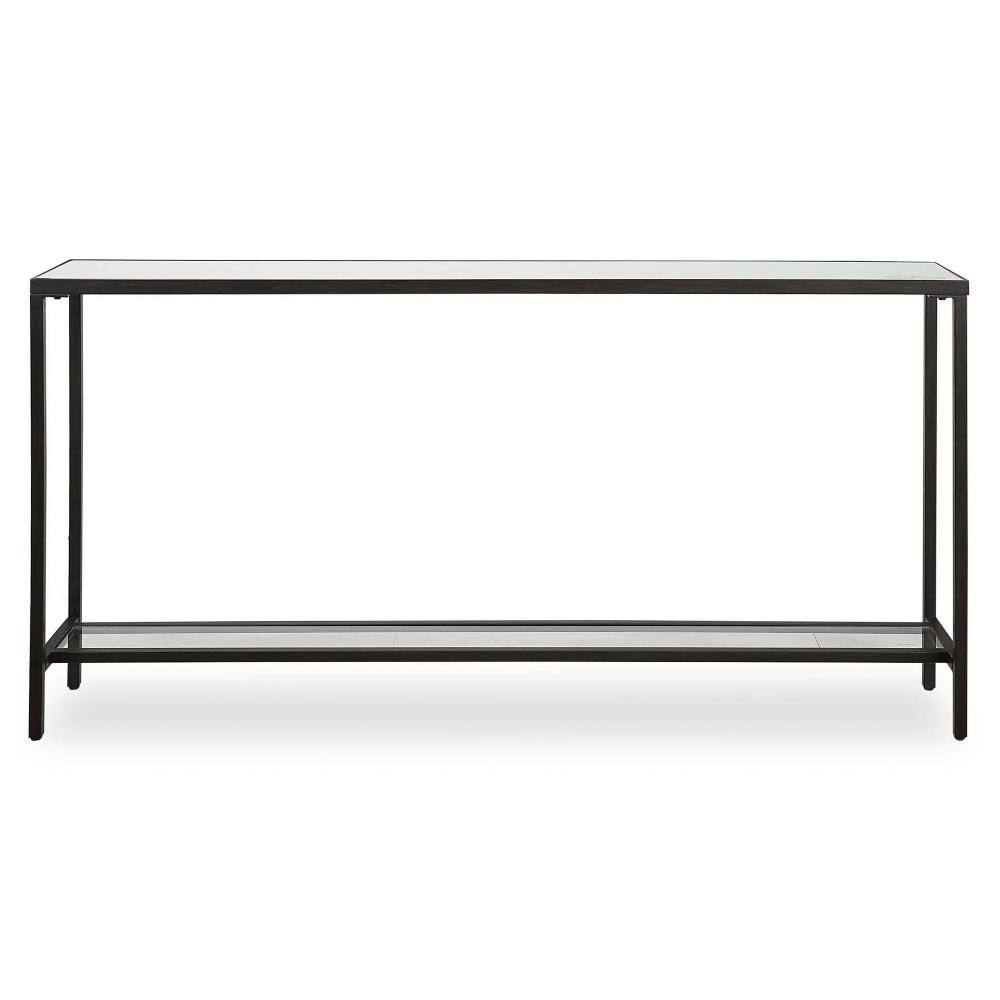 Classic And Minimalistic, This Narrow Console Table In Steel Is Finished With A Streamlined Matte Black, Inset With A Beveled Mirrored Top, And Gallery Shelf In Clear Glass.