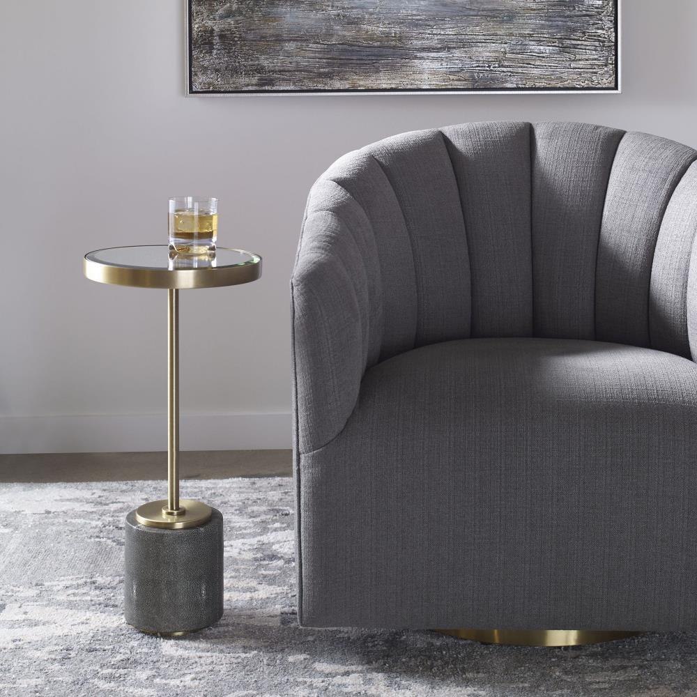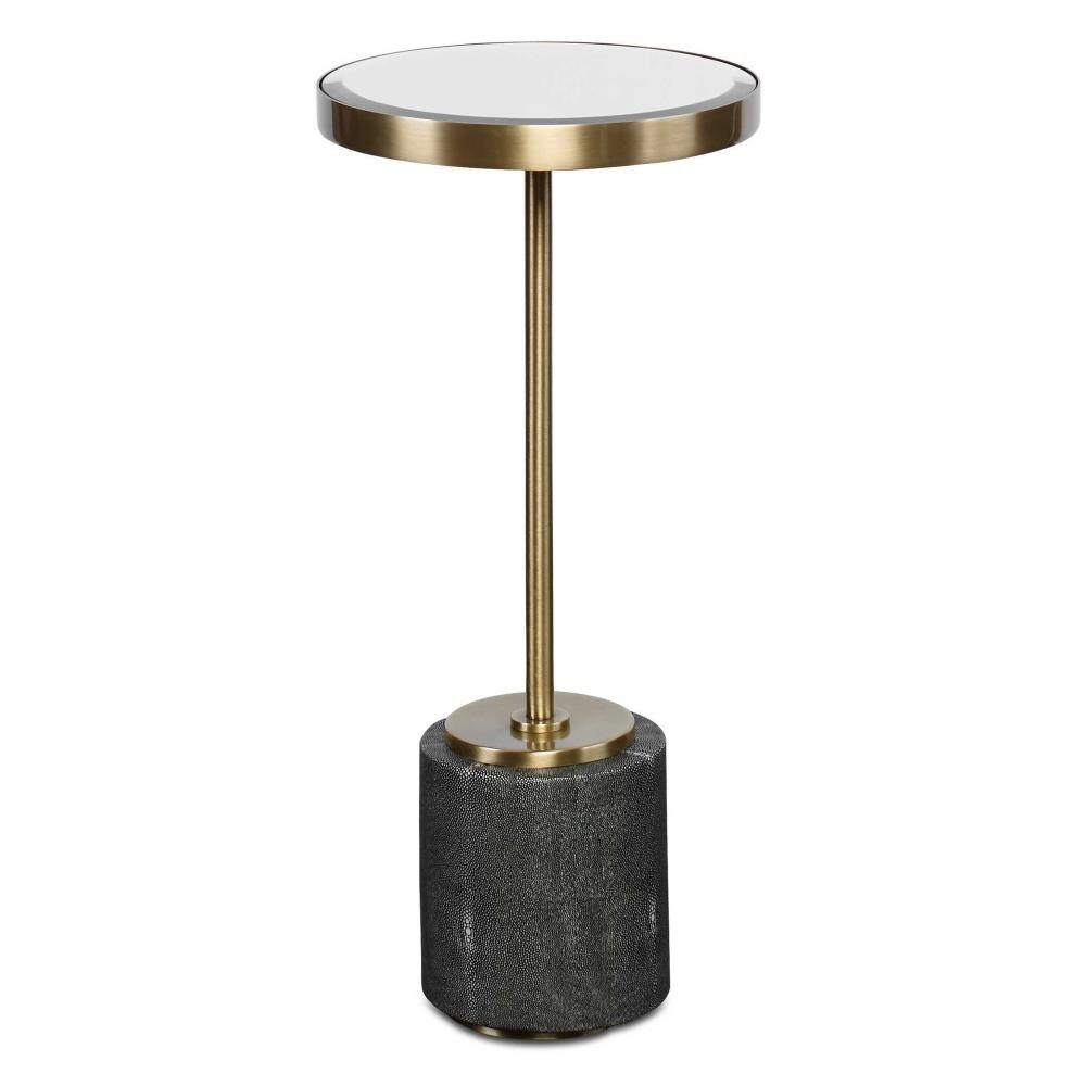 Stylish And Sophisticated, This Round Accent Table Features A Gray Faux Shagreen Base Paired With An Iron Support In Rich Brushed Brass And A Beveled Mirror Top.