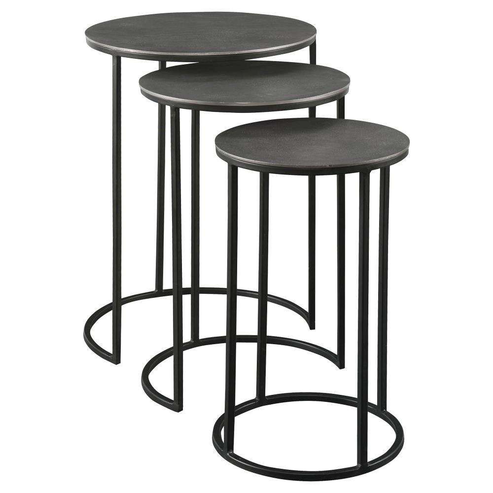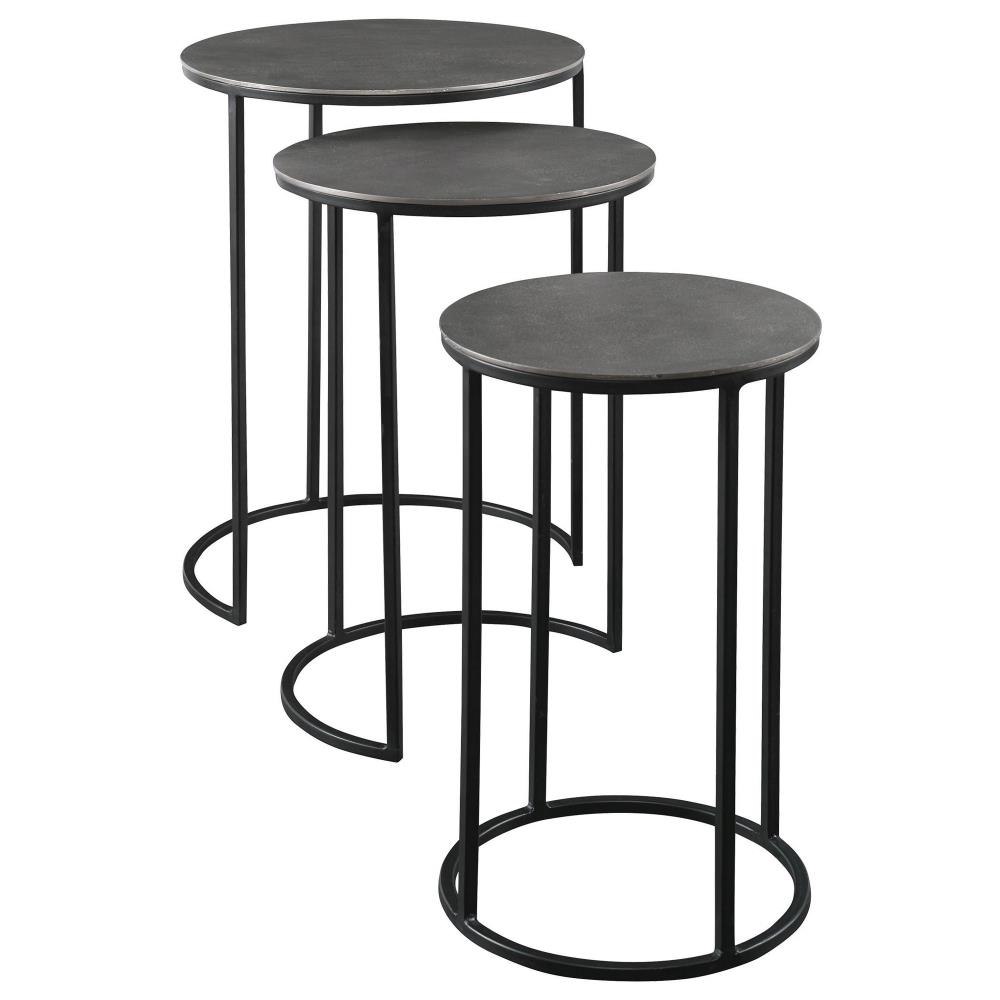 Set Of Three Functional Nesting Tables Constructed In An Aged Black Iron, Featuring A Textured Cast Aluminum Slab Top Finished In A Plated Antique Nickel. Sizes: S-12"x20", M-14"x22", L-17"x24"