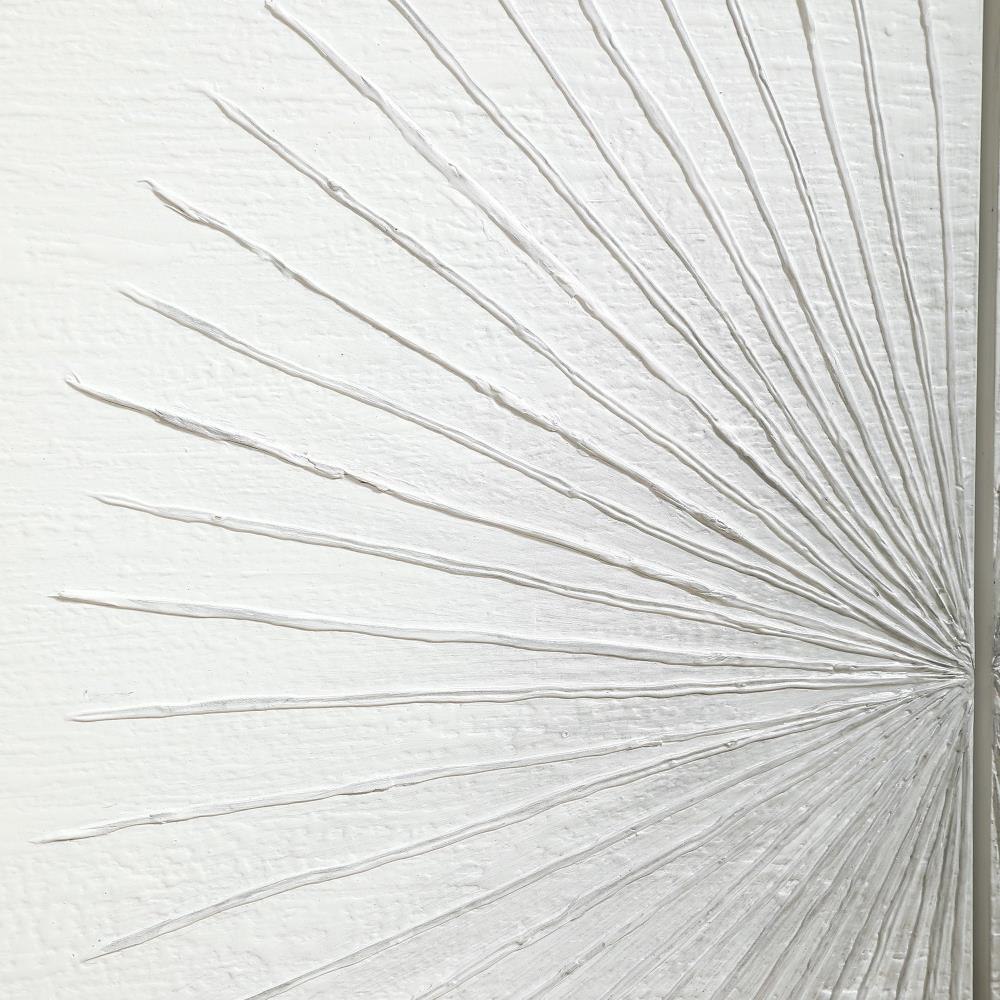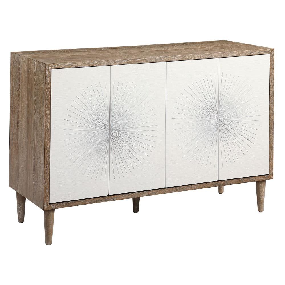 Showcasing Hints Of Scandinavian Design, This Four Door Accent Cabinet Provides A Functional Storage Piece With Versatile Style. Featuring Matte White Textured Doors With A Striking Starburst Design With Ombre Gray Centers. The Case Is Layered In Naturally Finished Oak Veneer With Wire Brushed Details, Set On Tapered Legs. Each Side Opens To Reveal 2 Adjustable Shelves.