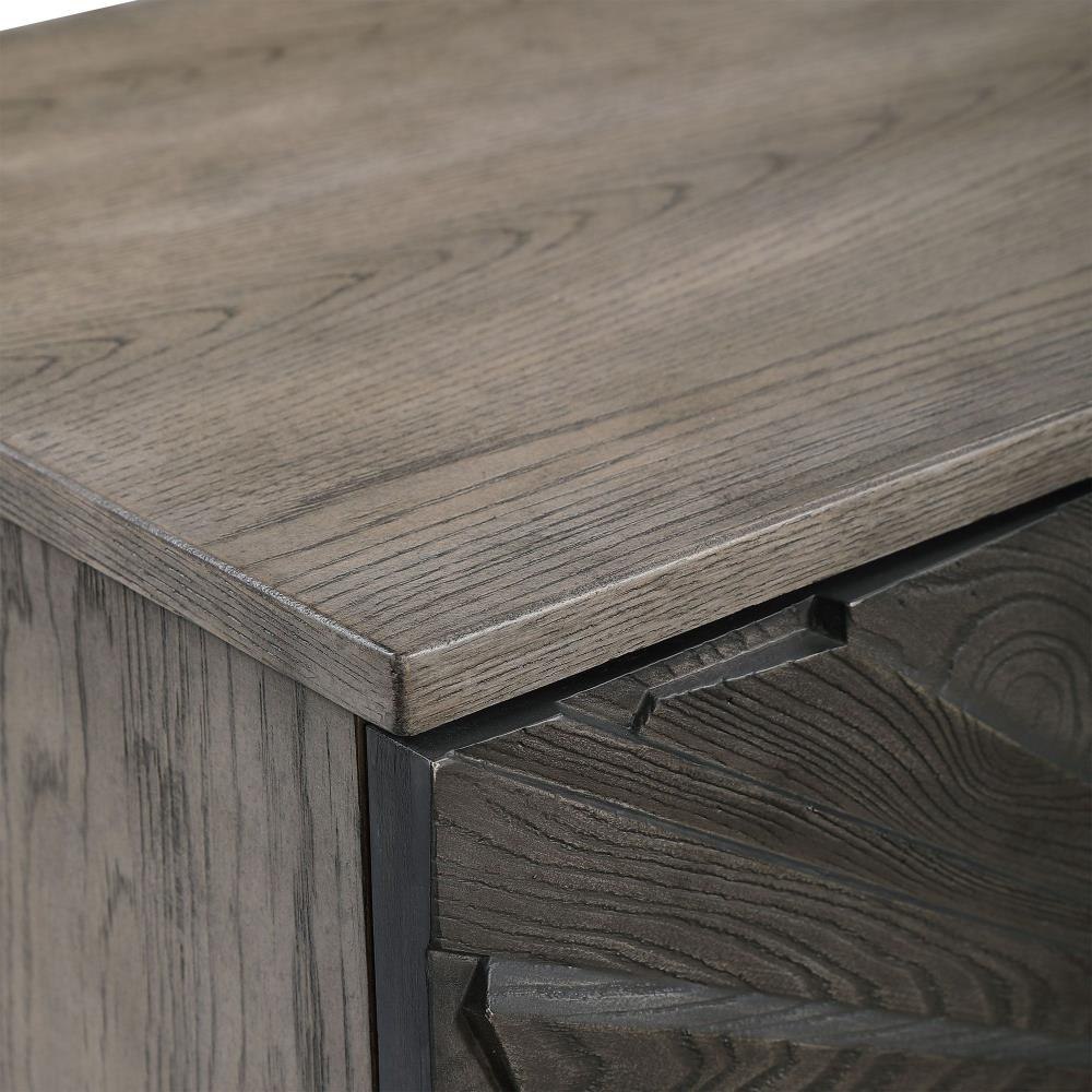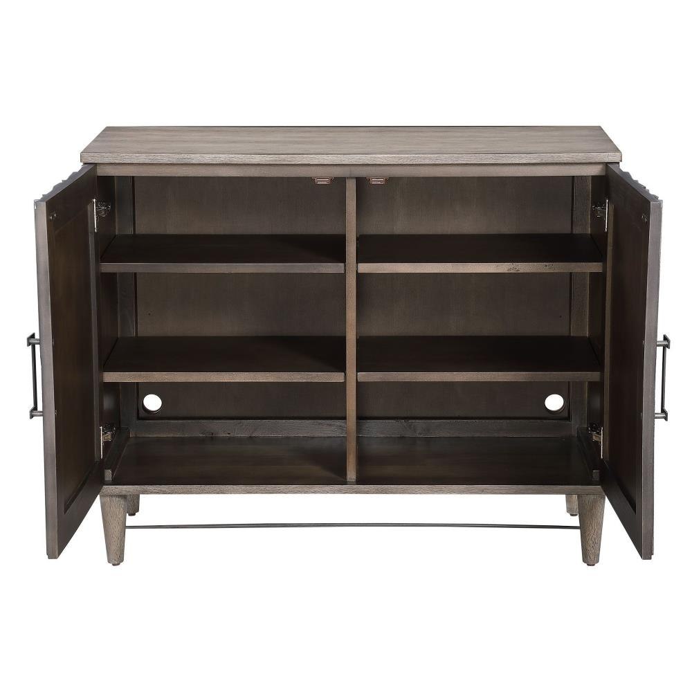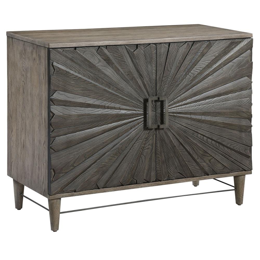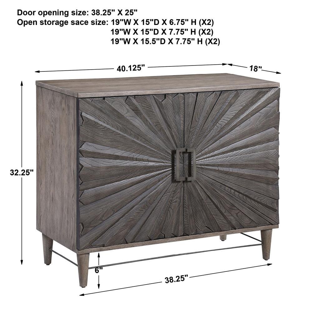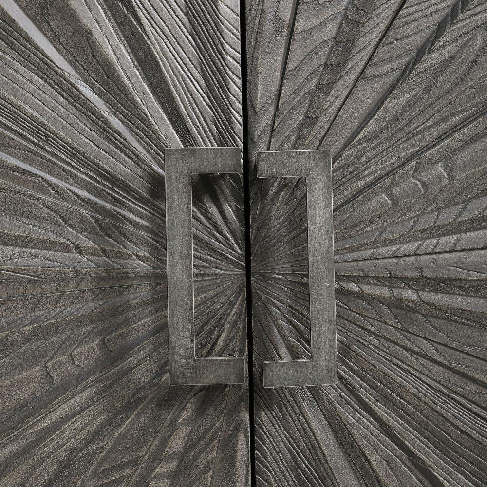 Inspired By Global Bohemian Style, This Two Door Cabinet Features A Striking 3-dimensional Starburst Design, Finished In A Dark Ebony Oak Veneer. The Contrasting Solid Wood Exterior Is Finished In A Gray Oak Stain, Accented By Steel Hardware And Accent Stretcher Finished In Aged Gunmetal. The Pair Of Soft Close Doors Open To Reveal 2 Sections Each With 2 Adjustable Shelves And Wire Management.