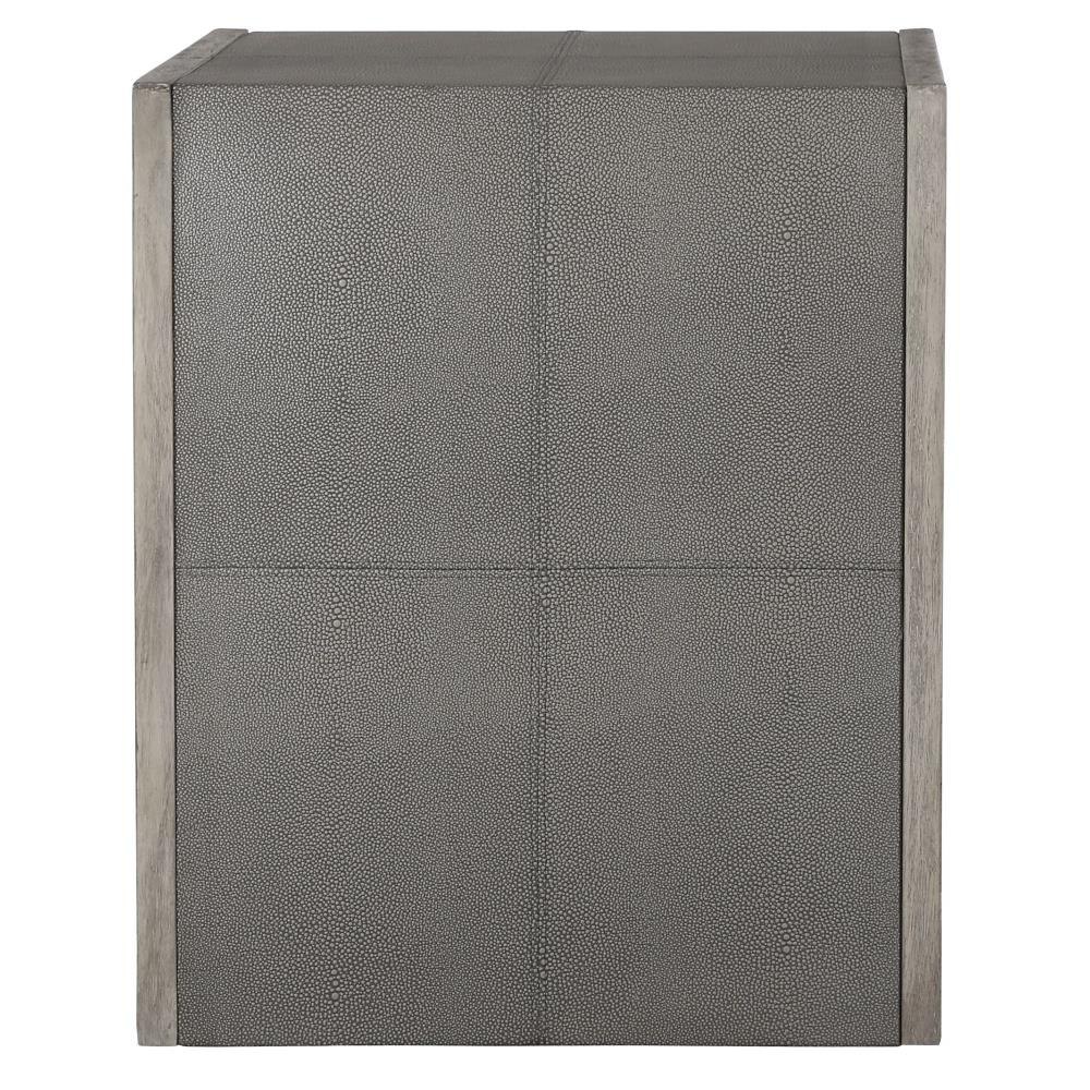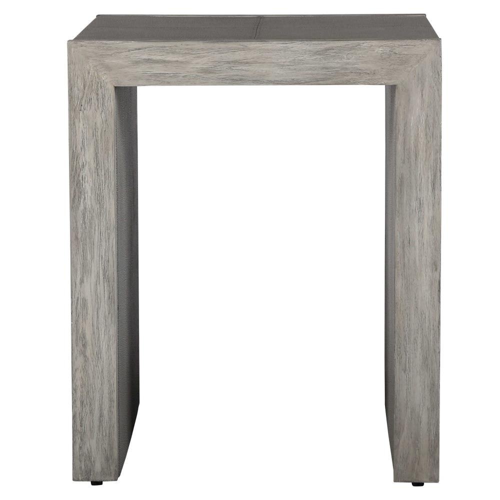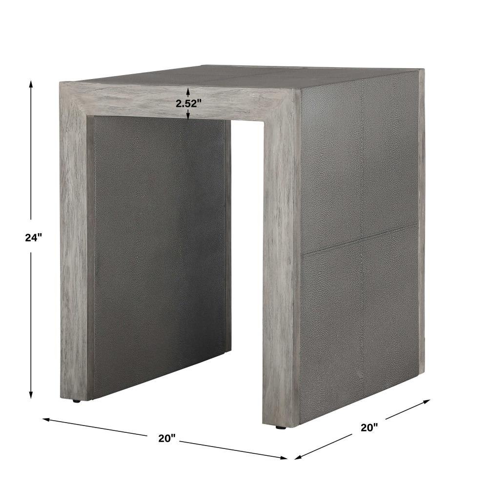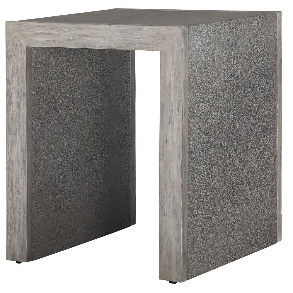 With Modern Elements, This Transitional Side Table Features Stitched Panels Of Light Gray Faux Shagreen, Paired With A Contrasting Wood Finish In A Aged White With Gray Distressed Details.