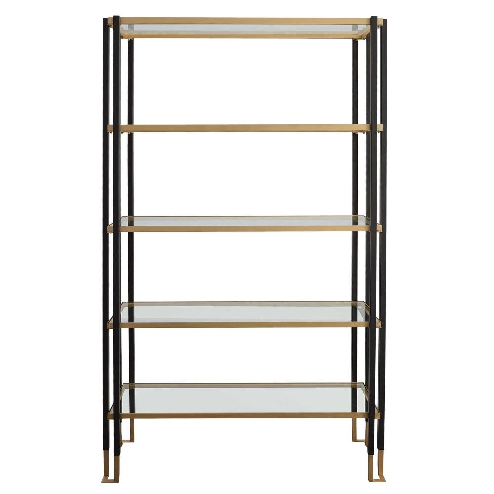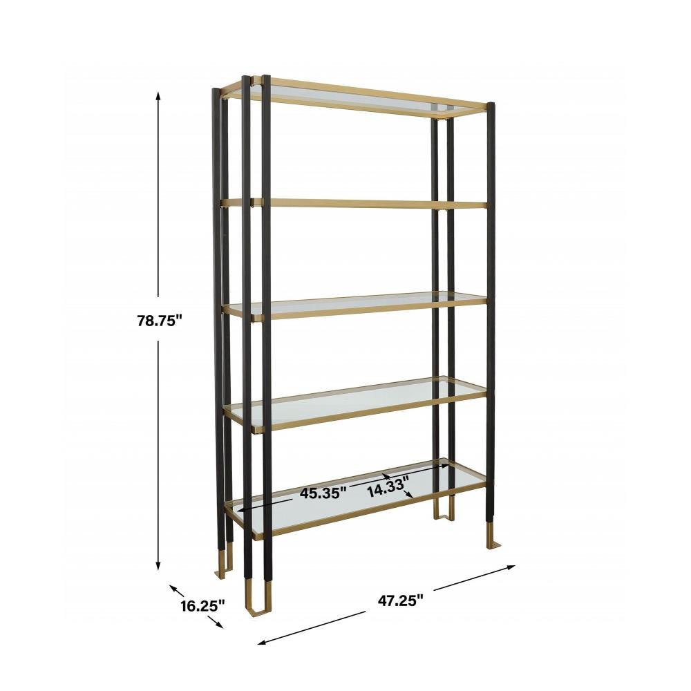Featuring A Clean Lined Solid Iron Frame, This Contemporary Etagere Is Finished In A Two-toned Matte Black And Brushed Gold. Has Five Tempered Glass Shelves Providing Ample Display Space.