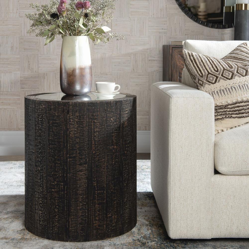 This Wooden Accent Table Brings Nature Indoors With A Rustic Dark Walnut Finish And Natural Woodgrain Texture, Complete With A Mirrored Top.