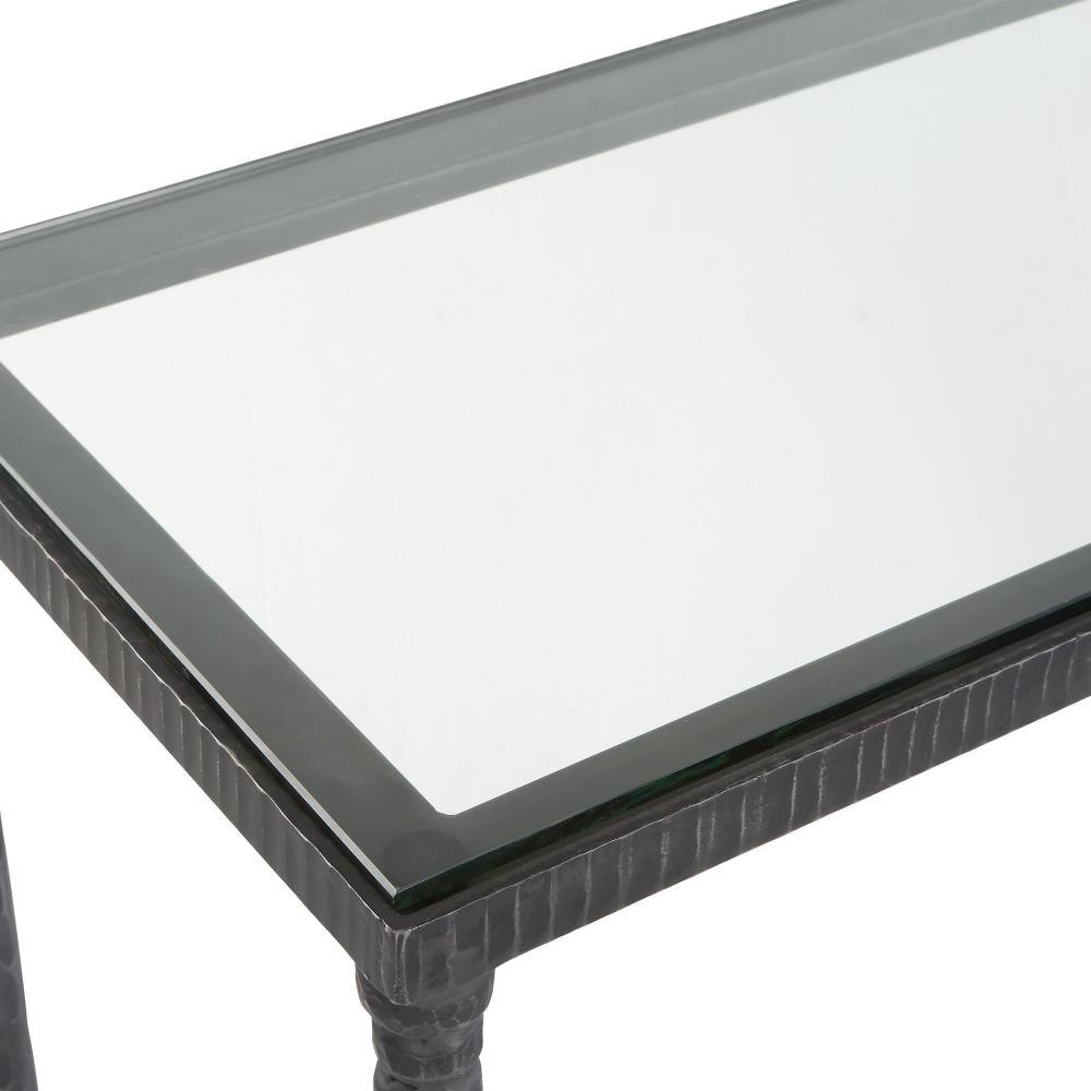 Crafted From Solid Iron, The Washington Console Is Finished In A Natural Rustic Black With Chiseled Details And Aged Distressing. Topped With Clear Tempered Glass.