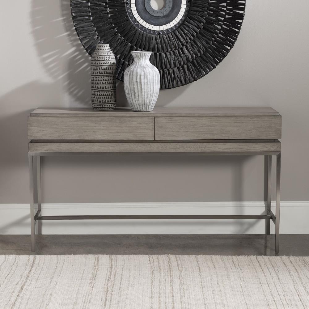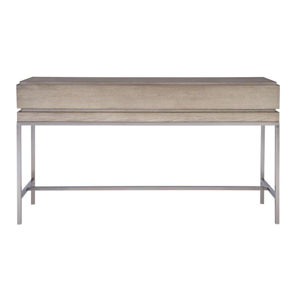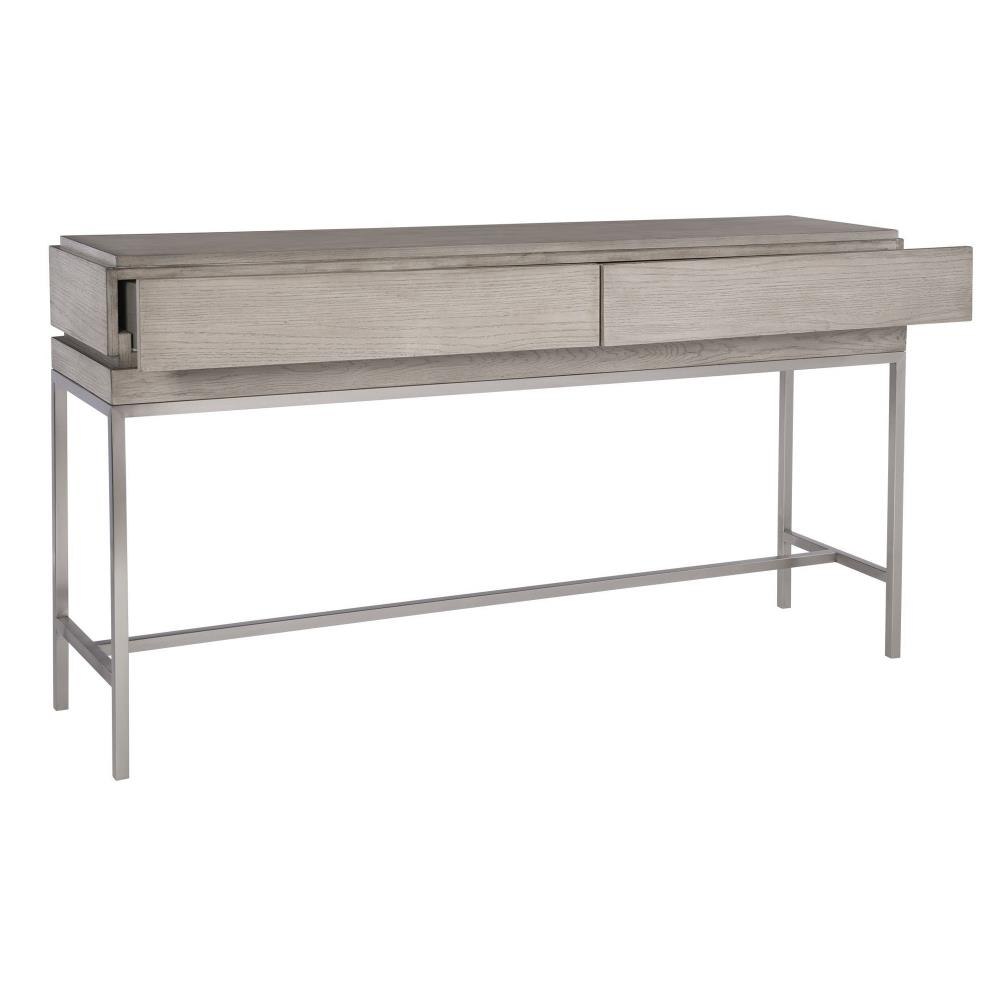 With Modern Simplicity, This Console Table Is Layered In An Oak Veneer And Finished In A Light Mushroom Gray Stain Featuring 2 Hidden Storage Drawers. Sits On A Stainless Steel Base Finished In Brushed Nickel.