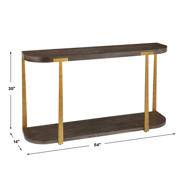 The Palisade Console Table Is Finished In A Rich Coffee Finished Oak Veneer With Natural Wood Grain Details Accented By Forged Metal Columns Finished In Mottled Antique Gold.