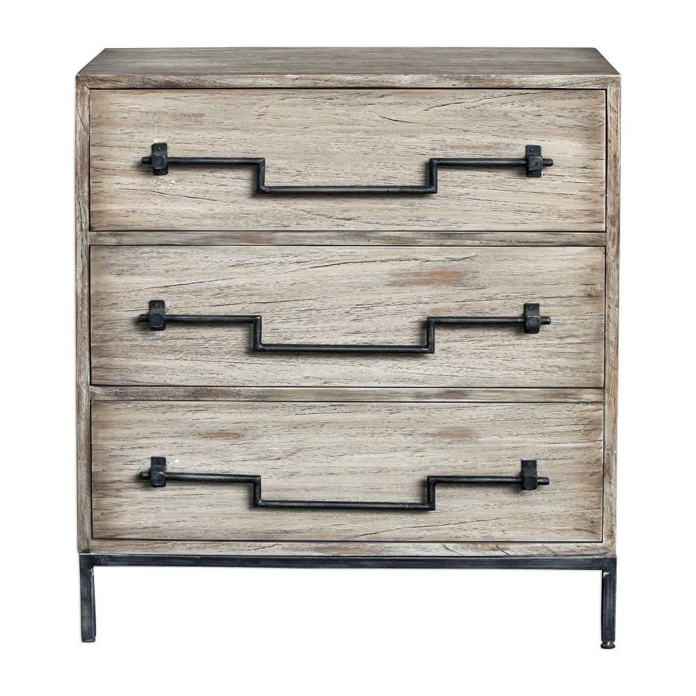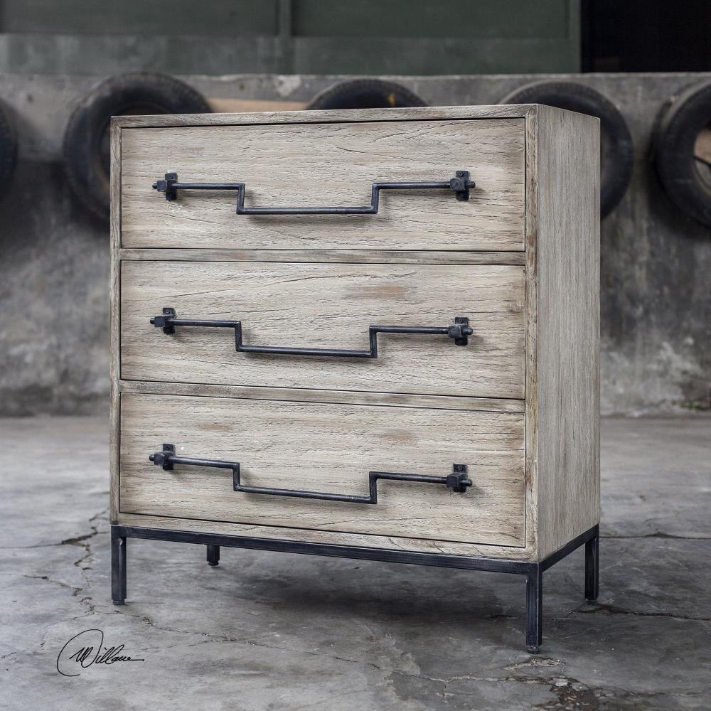 Constructed From Plantation Grown Mango Wood In An Aged Ivory Finish With Ember Highlights, Featuring Old Iron Drop Swing Bar Pulls, On An Industrial Iron Base.