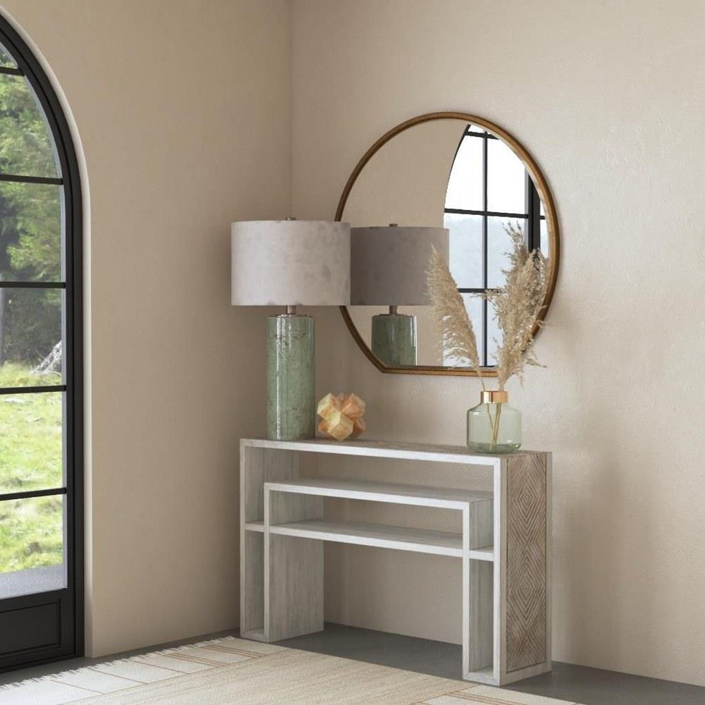 Finished In An Aged Bone White Over Mahogany Veneer With A Multi Level Display, Featuring A Hand Carved Geometric Top In Solid Mahogany Wood In A Warm Oatmeal Wash.