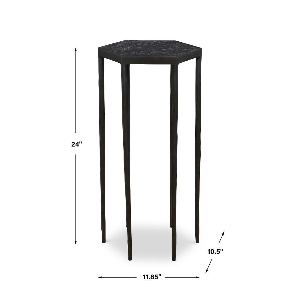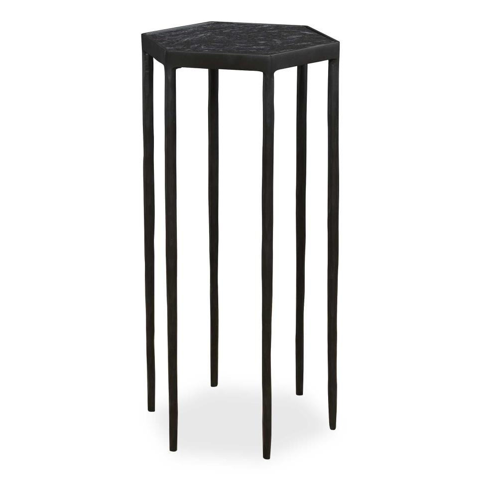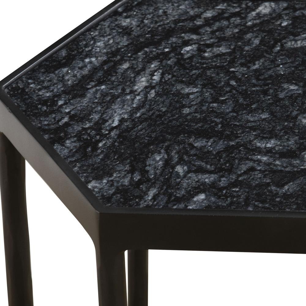 This Striking Hexagonal Table Features A Chiseled Iron Base Finished In Satin Black Paired With A Honed Black Marble Top With Natural White Veining. Because Of The Natural Characteristics Of Marble, Each Piece Will Have Unique Veining Patterns.