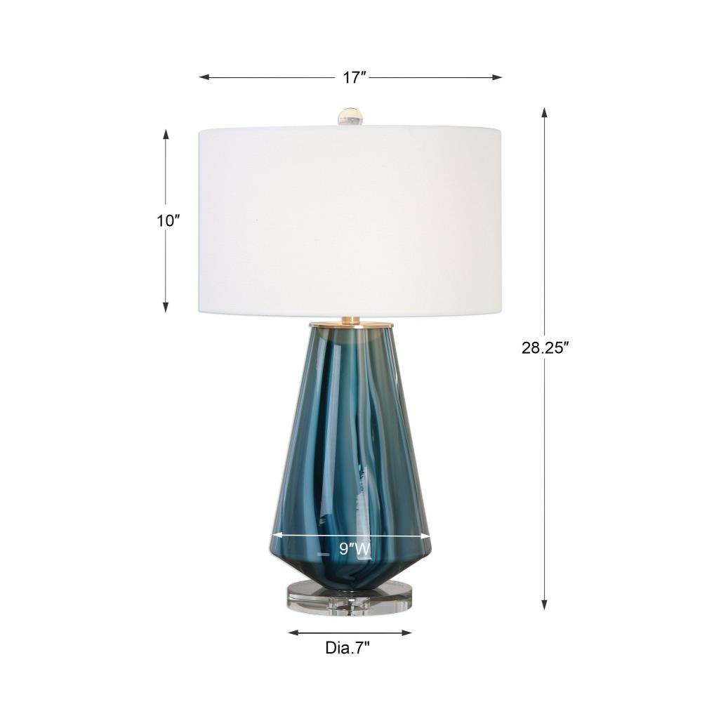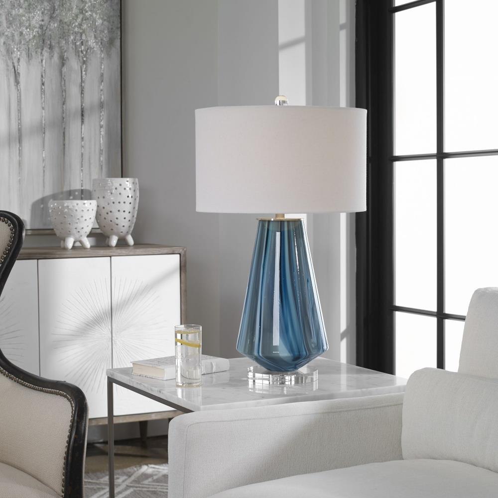 Teal-gray Glass Base Featuring Swirls Of Bold Blue Ivory Accented With Brushed Nickel Details And A Thick Crystal Foot. The Round Hardback Drum Shade Is An Ivory Linen Fabric.